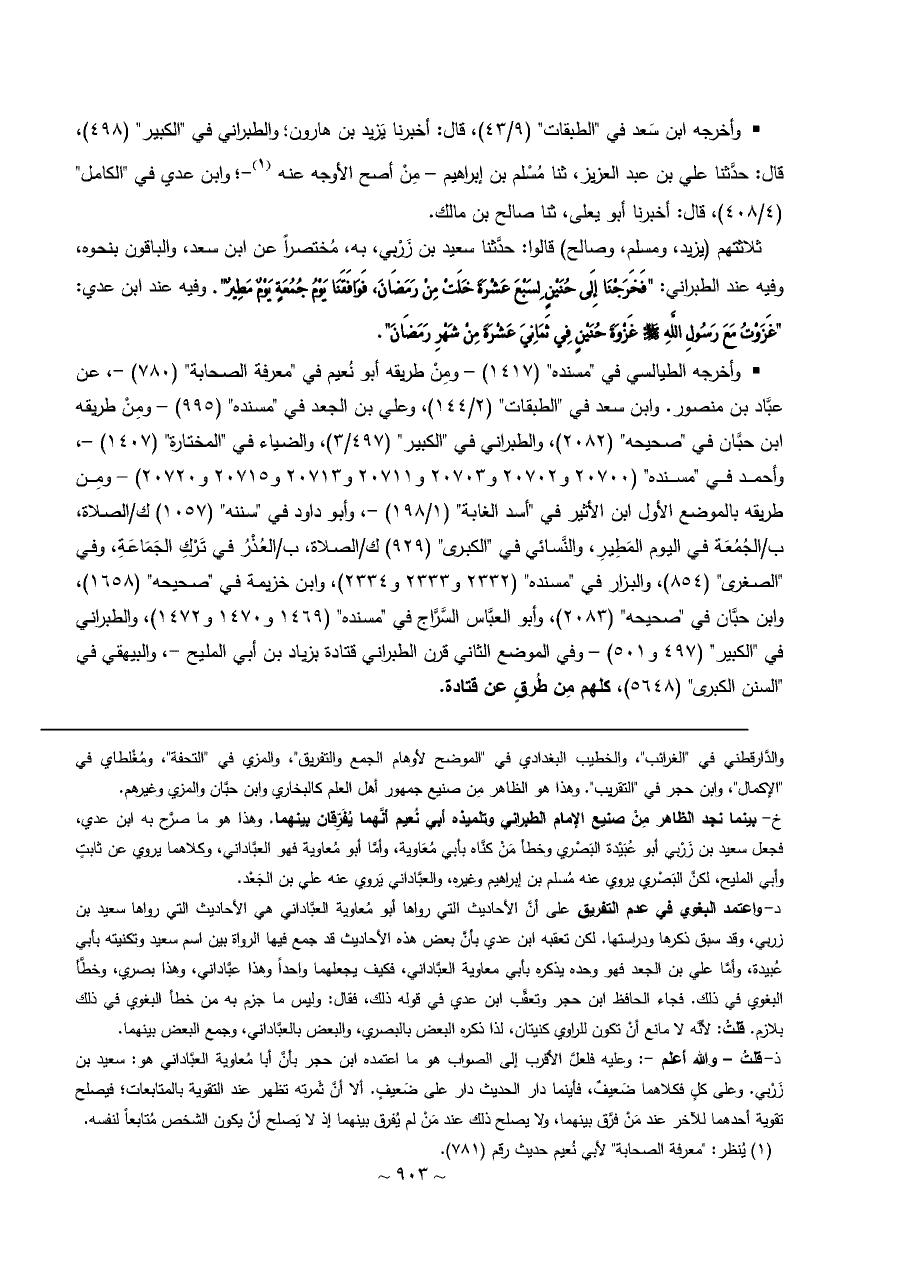 ثلاثتهم (يزيد، ومسلم، وصالح) قالوا: حدَّثنا سعيد بن زَرْبي، به، مُختصراً عن ابن سعد، والباقون بنحوه، وفيه عند الطبراني: "فَخَرَجْنَا إِلَى حُنَيْنٍ لِسَبْعَ عَشْرَةَ خَلَتْ مِنْ رَمَضَانَ، فَوَافَقَنَا يَوْمُ جُمُعَةٍ يَوْمٌ مَطِيرٌ". وفيه عند ابن عدي: "غَزَوْتُ مَعَ رَسُولِ اللَّهِ - صلى الله عليه وسلم - غَزْوَةَ حُنَيْنٍ فِي ثَمَانِيَ عَشْرَةَ مِنْ شَهْرِ رَمَضَانَ".