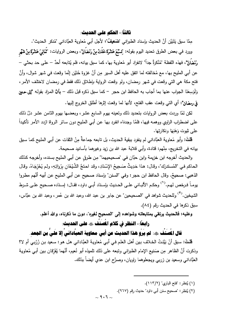 قلتُ: وأبو مُعاوية العبَّاداني لم ينفرد ببقية الحديث، بل تابعه جماعةٌ مِنْ الثقات عن أبي المليح كما سبق بيانه في التخريج، مِنْهم: قتادة، وأبي قلابة عبد الله بن زيد وغيرهما بأسانيد صحيحة.