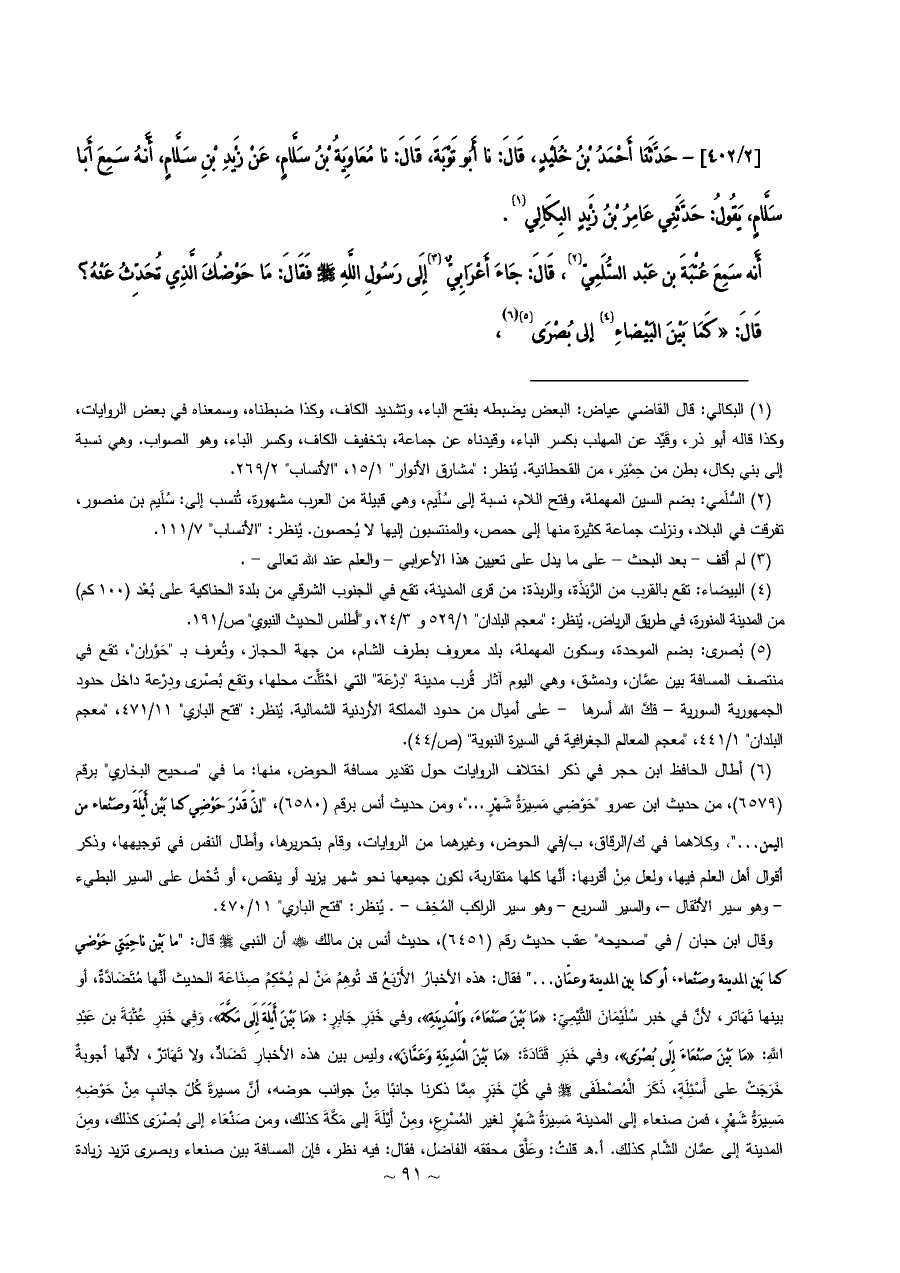 (¬٥) بُصرى: بضم الموحدة، وسكون المهملة، بلد معروف بطرف الشام، من جهة الحجاز، وتُعرف بـ "حَوْران"، تقع في منتصف المسافة بين عمَّان، ودمشق، وهي اليوم آثار قُرب مدينة "دِرْعَة" التي احْتَلَّت محلها، وتقع بُصْرى ودِرْعة داخل حدود الجمهورية السورية - فكَّ الله أسرها - على أميال من حدود المملكة الأردنية الشمالية. يُنظر: "فتح الباري" ١١/ ٤٧١، "معجم البلدان" ١/ ٤٤١، "معجم المعالم الجغرافية في السيرة النبوية" (ص/٤٤).