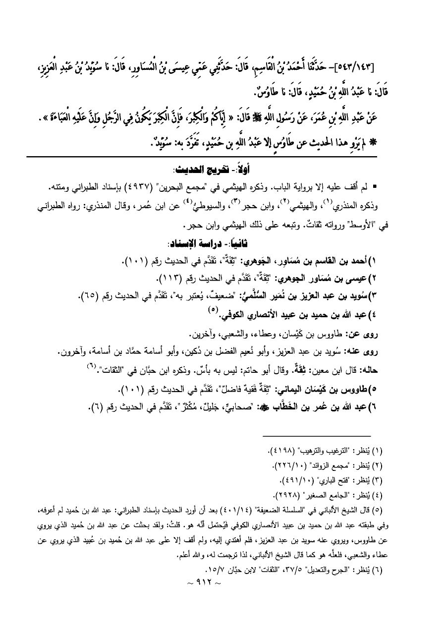 [١٤٣/ ٥٤٣]- حَدَّثَنَا أَحْمَدُ بْنُ الْقَاسِمِ، قَالَ: حَدَّثَنِي عَمِّي عِيسَى بْنُ الْمُسَاوِرِ، قَالَ: نا سُوَيْدُ بْنُ عَبْدِ الْعَزِيزِ، قَالَ: نا عَبْدُ اللَّهِ بْنُ حُمَيْدٍ، قَالَ: نا طَاوُسٌ.