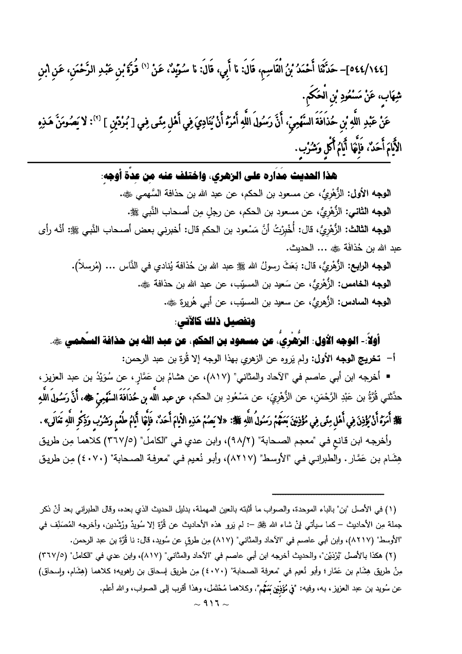 [١٤٤/ ٥٤٤]- حَدَّثَنَا أَحْمَدُ بْنُ الْقَاسِمِ، قَالَ: نا أَبِي، قَالَ: نا سُوَيْدٌ، عَنْ (¬١) قُرَّةَ بْنِ عَبْدِ الرَّحْمَنِ، عَنِ ابْنِ شِهَابٍ، عَنْ مَسْعُودِ بْنِ الْحَكَمِ.