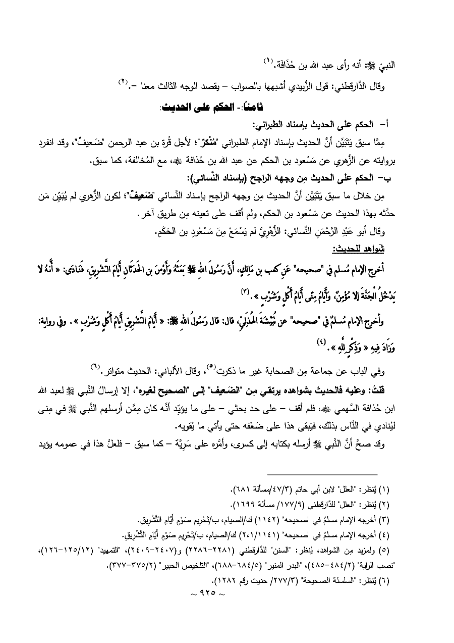 قلتُ: وعليه فالحديث بشواهده يرتقي مِن "الضَعيف" إلى "الصحيح لغيره"، إلا إرسالُ النَّبي - صلى الله عليه وسلم - لعبد الله ابن حُذافة السَّهمي - رضي الله عنه -، فلم أقف - على حد بحثي - على ما يؤيِّد أنَّه كان مِمَّن أرسلهم النَّبي - صلى الله عليه وسلم - في مِنى ليُنادي في النَّاس بذلك، فيَبقى هذا على ضَعْفه حتى يأتي ما يُقويه.