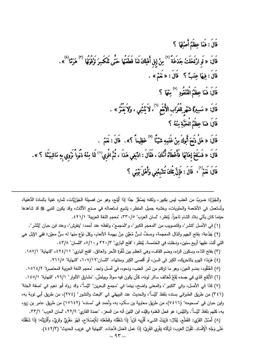(¬١) جَذَعة: بفتح الجيم والذال المعجمة، وصفٌ لسنٍّ مُعَيَّنٍ مِنْ بهيمة الأنعام، وكل نوْع منها له سنٍّ معيّن؛ ففي الإبل هي التي أتت عليها أربع سنين، ودخلت في الخامسة. يُنظر: "فتح الباري" ٣/ ٣٢٠ و ١٠/ ٥، "اللسان" ٨/ ٤٣.