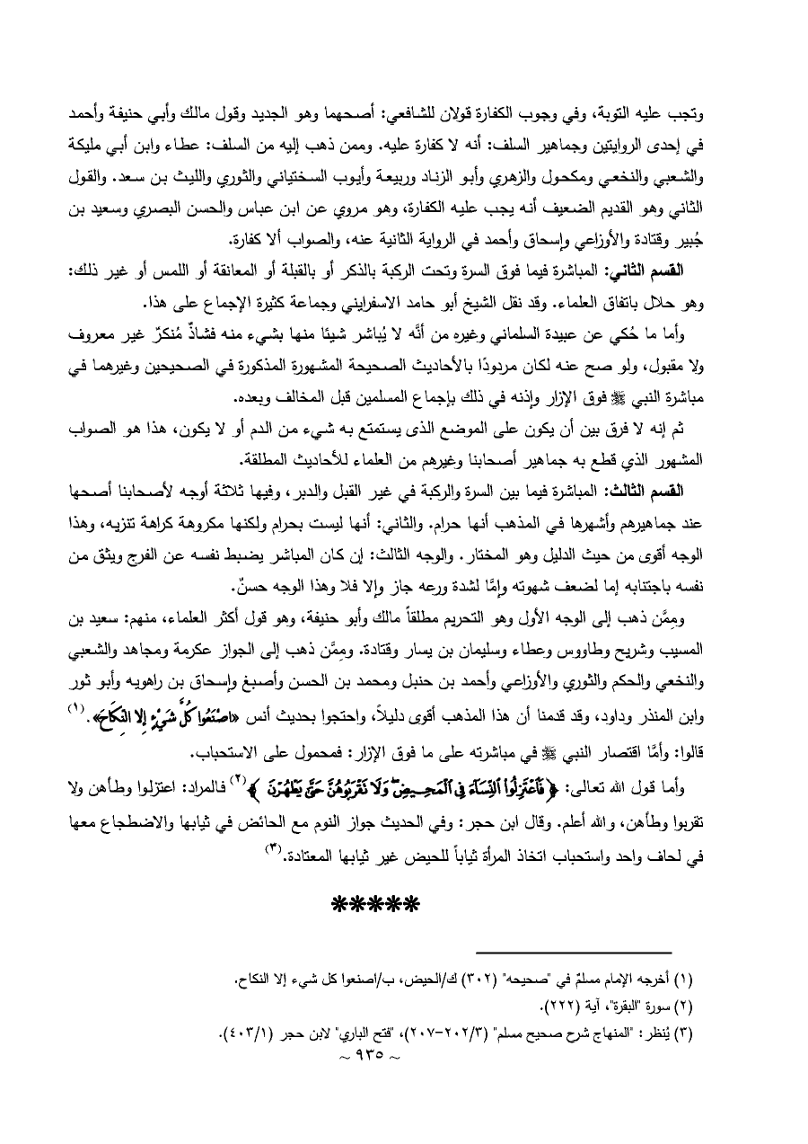 ومِمَّن ذهب إلى الوجه الأول وهو التحريم مطلقاً مالك وأبو حنيفة، وهو قول أكثر العلماء، منهم: سعيد بن المسيب وشريح وطاووس وعطاء وسليمان بن يسار وقتادة. ومِمَّن ذهب إلى الجواز عكرمة ومجاهد والشعبي والنخعي والحكم والثوري والأوزاعي وأحمد بن حنبل ومحمد بن الحسن وأصبغ وإسحاق بن راهويه وأبو ثور وابن المنذر وداود، وقد قدمنا أن هذا المذهب أقوى دليلاً، واحتجوا بحديث أنس «اصْنَعُوا كُلَّ شَيْءٍ إِلا النِّكَاحَ». (¬١) قالوا: وأمَّا اقتصار النبي - صلى الله عليه وسلم - في مباشرته على ما فوق الإزار: فمحمول على الاستحباب.