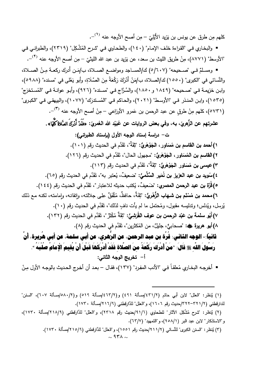 • ومسلمٌ في "صحيحه" (٦٠٧/ ٥) ك/المساجد ومواضع الصلاة، ب/مَن أَدرك ركعة مِنْ الصلاة، والنَّسائي في "الكبرى" (١٥٥٠) ك/الصلاة، ب/مَنْ أَدْرَكَ رَكْعَةً مِنَ الصَّلَاةِ، وأبو يَعْلى في "مسنده" (٥٩٨٨)، وابن خزيمة في "صحيحه" (١٨٤٩ و ١٨٥٠)، والسَّرَّاج في "مسنده" (٩٢٦)، وأبو عوانة في "المُستخرَج" (١٥٣٥)، وابن المنذر في "الأوسط" (٢٠٢١)، والحاكم في "المُستدرَك" (١٠٧٧)، والبيهقي في "الكبرى" (٥٧٣١)، كلهم مِنْ طرقٍ عن عبد الرحمن بن عَمرو الأوزاعي - مِنْ أصح الأوجه عنه (¬٣) -.