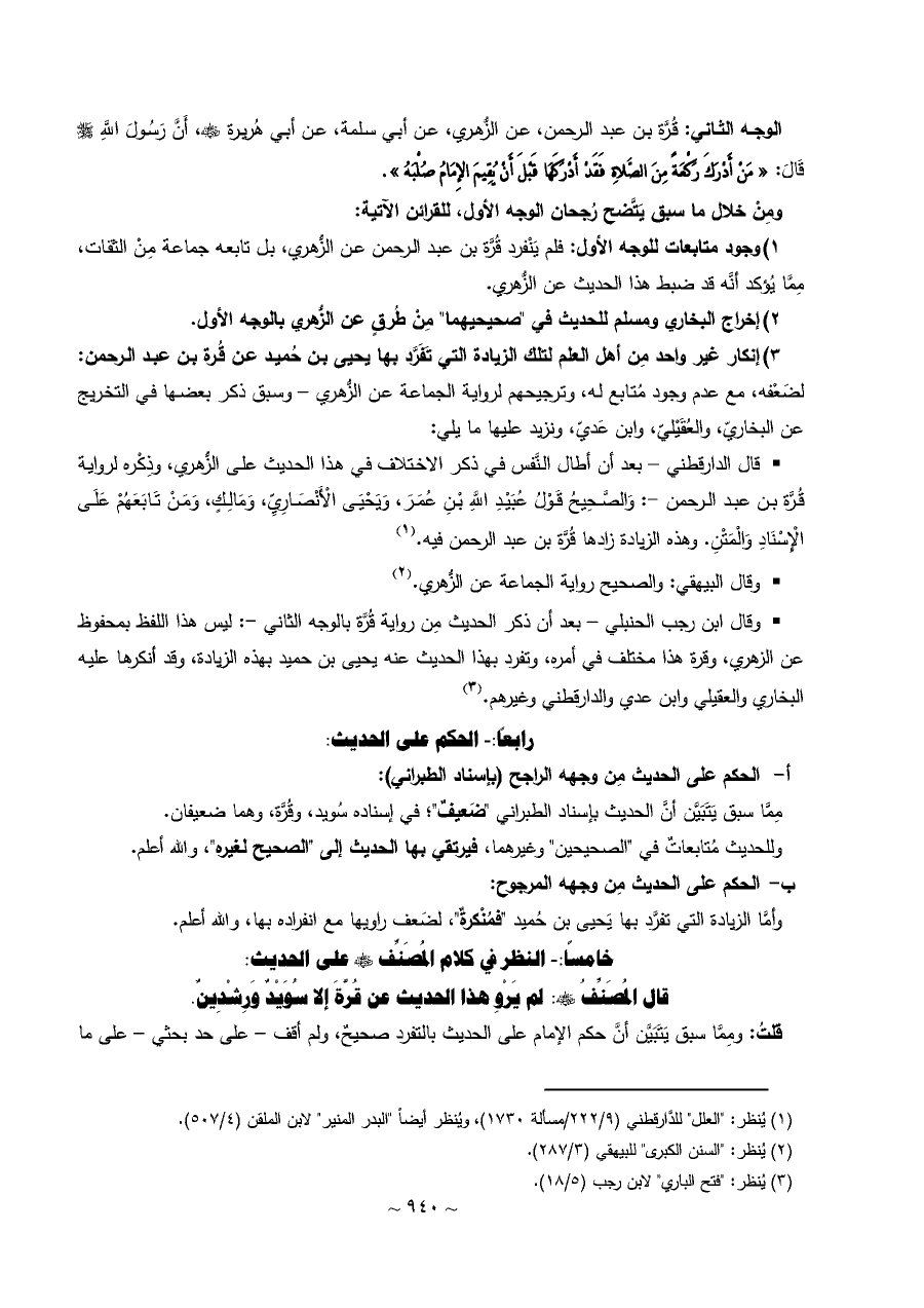 الوجه الثاني: قُرَّة بن عبد الرحمن، عن الزُّهري، عن أبي سلمة، عن أبي هُريرة - رضي الله عنه -، أَنَّ رَسُولَ اللَّهِ - صلى الله عليه وسلم - قَالَ: «مَنْ أَدْرَكَ رَكْعَةً مِنَ الصَّلاةِ فَقَدْ أَدْرَكَهَا قَبْلَ أَنْ يُقِيمَ الإِمَامُ صُلْبَهُ».