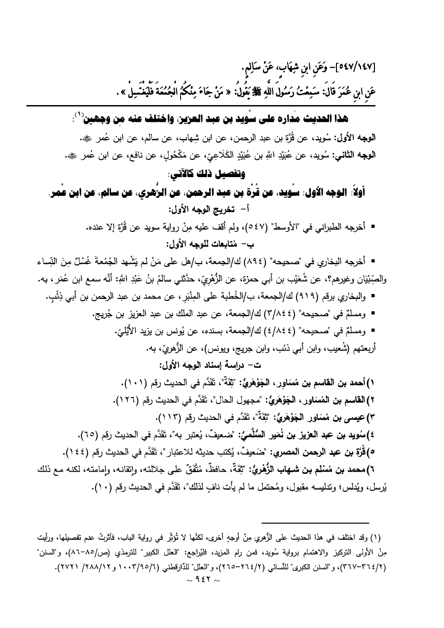 أولاً: الوجه الأول: سُويد، عن قُرَّة بن عبد الرحمن، عن الزُّهري، عن سالم، عن ابن عُمر.