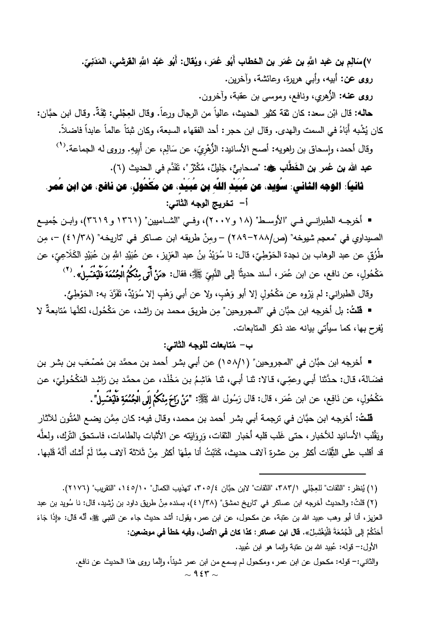 • أخرجه الطبراني في "الأوسط" (١٨ و ٢٠٠٧)، وفي "الشاميين" (١٣٦١ و ٣٦١٩)، وابن جُميع الصيداوي في "معجم شيوخه" (ص/٢٨٨ - ٢٨٩) - ومِنْ طريقه ابن عساكر في "تاريخه" (٣٨/ ٤١) -، مِن طُرُقٍ عن عبد الوهاب بن نجدة الحَوْطِيّ، قال: نا سُوَيْدُ بنُ عبد العَزِيز، عن عُبَيْدِ اللَّهِ بن عُبَيْدٍ الكَلَاعِيِّ، عن مَكْحُولٍ، عن نافع، عن ابن عُمَر، أسند حديثًا إلى النَّبِيِّ - صلى الله عليه وسلم -، فقال: «مَنْ أَتَى مِنْكُمُ الْجُمُعَةَ فَلْيَغْتَسِلْ». (¬٢)