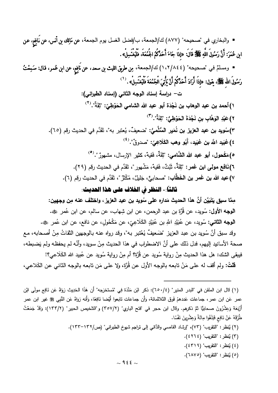 • ومسلمٌ في "صحيحه" (٨٤٤/ ١،٢) ك/الجمعة، مِن طريق الليث بن سعد، عن نَافِعٍ، عن ابن عُمر، قال: سَمِعْتُ رَسُولَ اللهِ - صلى الله عليه وسلم -، يقول: «إِذَا أَرَادَ أَحَدُكُمْ أَنْ يَأْتِيَ الْجُمُعَةَ فَلْيَغْتَسِلْ». (¬١)