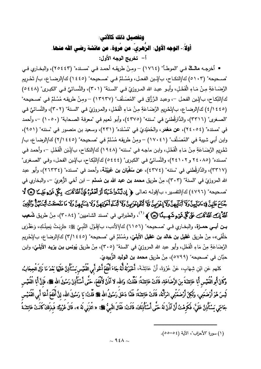 • أخرجه مالكٌ في "الموطأ" (١٧٦٤) - ومِنْ طريقه أحمد في "مسنده" (٢٥٤٤٣)، والبخاري في "صحيحه" (٥١٠٣) ك/النكاح، ب/لبن الفحل، ومُسْلمٌ في "صحيحه" (١٤٤٥) ك/الرضاع، ب/ تَحْرِيمِ الرَّضَاعَةِ مِنْ مَاءِ الْفَحْلِ، وأبو عبد الله المروزيّ في "السنة" (٣٠١)، والنَّسائيُّ في "الكبرى" (٥٤٤٨) ك/النِّكاح، ب/لبن الفحل -، وعبد الرَّزَّاق في "المُصَنَّف" (١٣٩٣٧) - ومِنْ طريقه مُسْلمٌ في "صحيحه" (١٤٤٥/ ٤) ك/الرضاع، ب/تَحْرِيمِ الرَّضَاعَةِ مِنْ مَاءِ الْفَحْلِ، والمروزيّ في "السنة" (٣٠٢)، والنَّسائيُّ في "الصغرى" (٣٣١٦)، والدَّارقُطنيّ في "سننه" (٤٣٧٥)، وأبو نُعيم في "معرفة الصحابة" (١٠٥٠) -، وأحمد في "مسنده" (٢٤٠٥٤)، عن مَعْمَر، والحُمَيْديّ في "مُسْنَده" (٢٣١)، وسعيد بن منصور في "سننه" (٩٥١)، وابن أبي شيبة في "المُصَنَّف" (١٧٠٤١) - ومِنْ طريقه مُسْلمٌ في "صحيحه" (١٤٤٥/ ٢) ك/الرضاع، ب/ تَحْرِيمِ الرَّضَاعَةِ مِنْ مَاءِ الْفَحْلِ، وابن ماجه في "سننه" (١٩٤٨) ك/النكاح، ب/لَبَن الْفَحْلِ -، وأحمد في "مسنده" (٢٤٠٨٥ و ٢٤١٠٢)، والنَّسائيُّ في "الكبرى" (٥٤٤٤) ك/النِّكاح، ب/لبن الفحل، وفي "الصغرى" (٣٣١٧)، والدَّارقُطني في "سننه" (٤٣٧٤)، عن سُفْيَان بن عُيَيْنَة، وأحمد في "مسنده" (٢٦٣٣٤)، وأبو عبد الله المروزيّ في "السنة" (٣٠٣)، مِنْ طريق محمد بن عبد الله بن مُسلم - ابن أخي الزُّهريّ -، والبخاري في "صحيحه" (٤٧٩٦) ك/التفسير، ب/قوله تعالى {إِنْ تُبْدُوا شَيْئًا أَوْ تُخْفُوهُ فَإِنَّ اللَّهَ كَانَ بِكُلِّ شَيْءٍ عَلِيمًا (٥٤) لَا جُنَاحَ عَلَيْهِنَّ فِي آبَائِهِنَّ وَلَا أَبْنَائِهِنَّ وَلَا إِخْوَانِهِنَّ وَلَا أَبْنَاءِ إِخْوَانِهِنَّ وَلَا أَبْنَاءِ أَخَوَاتِهِنَّ وَلَا نِسَائِهِنَّ وَلَا مَا مَلَكَتْ أَيْمَانُهُنَّ وَاتَّقِينَ اللَّهَ إِنَّ اللَّهَ كَانَ عَلَى كُلِّ شَيْءٍ شَهِيدًا (٥٥)} (¬١)،