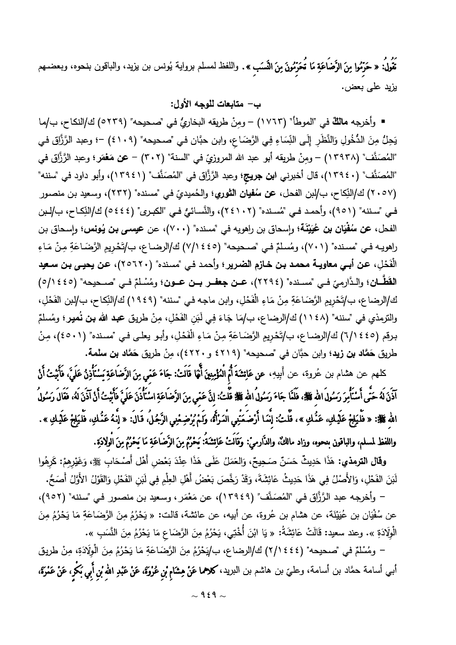 • وأخرجه مالكٌ في "الموطأ" (١٧٦٣) - ومِنْ طريقه البخاريُّ في "صحيحه" (٥٢٣٩) ك/النكاح، ب/ما يَحِلُّ مِنَ الدُّخُولِ وَالنَّظَرِ إِلَى النِّسَاءِ فِي الرَّضَاعِ، وابن حبَّان في "صحيحه" (٤١٠٩) -؛ وعبد الرَّزَّاق في "المُصَنَّف" (١٣٩٣٨) - ومِنْ طريقه أبو عبد الله المروزيّ في "السنة" (٣٠٢) - عن مَعْمَر؛ وعبد الرَّزَّاق في "المُصَنَّف" (١٣٩٤٠)، قال أخبرني ابن جريجٍ؛ وعبد الرَّزَّاق في "المُصَنَّف" (١٣٩٤١)، وأبو داود في "سننه" (٢٠٥٧) ك/النِّكاح، ب/لبن الفحل، عن سُفيان الثوري؛ والحُميديّ في "مسنده" (٢٣٢)، وسعيد بن منصور في "سننه" (٩٥١)، وأحمد في "مُسنده" (٢٤١٠٢)، والنَّسائيُّ في "الكبرى" (٥٤٤٤) ك/النِّكاح، ب/لبن الفحل، عن سُفْيَان بن عُيَيْنَة؛ وإسحاق بن راهويه في "مسنده" (٧٠٠)، عن عيسى بن يُونس؛ وإسحاق بن راهويه في "مسنده" (٧٠١)، ومُسلمٌ في "صحيحه" (١٤٤٥/ ٧) ك/الرضاع، ب/تَحْرِيمِ الرَّضَاعَةِ مِنْ مَاءِ الْفَحْلِ، عن أبي معاوية محمد بن خازم الضرير؛ وأحمد في "مسنده" (٢٥٦٢٠)، عن يحيى بن سعيد القَطَّان؛ والدَّارميّ في "مسنده" (٢٢٩٤)، عن جعفر بن عون؛ ومُسْلمٌ في "صحيحه" (١٤٤٥/ ٥) ك/الرضاع، ب/تَحْرِيمِ الرَّضَاعَةِ مِنْ مَاءِ الْفَحْلِ، وابن ماجه في "سننه" (١٩٤٩) ك/النِّكاح، ب/لبن الفَحْلِ، والترمذي في "سننه" (١١٤٨) ك/الرضاع، ب/مَا جَاءَ فِي لَبَنِ الفَحْلِ، مِنْ طريق عبد الله بن نُمير؛ ومُسلمٌ برقم (١٤٤٥/ ٦) ك/الرضاع، ب/تَحْرِيمِ الرَّضَاعَةِ مِنْ مَاءِ الْفَحْلِ، وأبو يعلى في "مسنده" (٤٥٠١)، مِنْ طريق حَمَّاد بن زيد؛ وابن حبَّان في "صحيحه" (٤٢١٩ و ٤٢٢٠)، مِنْ طريق حَمَّاد بن سلمة.