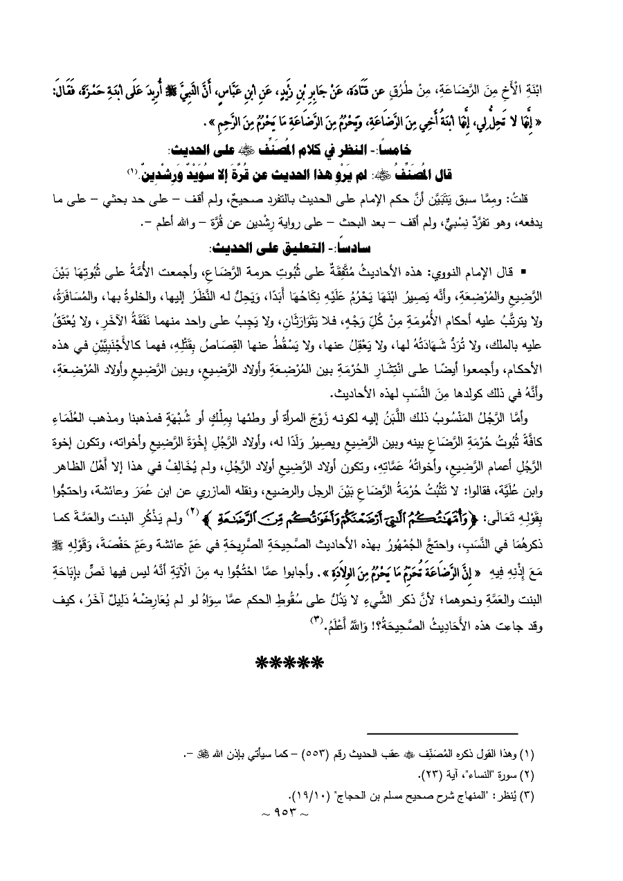 ابْنَةِ الْأَخِ مِنَ الرَّضَاعَةِ، مِنْ طُرُقٍ عن قَتَادَة، عَنْ جَابِرِ بْنِ زَيْدٍ، عَنِ ابْنِ عَبَّاسٍ، أَنَّ النَّبِيَّ - صلى الله عليه وسلم - أُرِيدَ عَلَى ابْنَةِ حَمْزَةَ، فَقَالَ: ... «إِنَّهَا لا تَحِلُّ لِي، إِنَّهَا ابْنَةُ أَخِي مِنَ الرَّضَاعَةِ، وَيَحْرُمُ مِنَ الرَّضَاعَةِ مَا يَحْرُمُ مِنَ الرَّحِمِ».