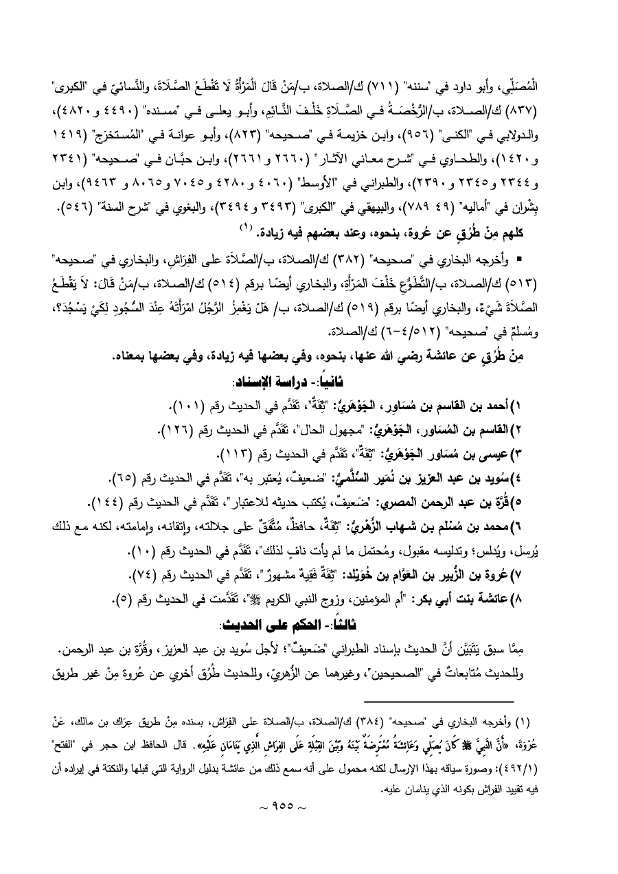 الْمُصَلِّي، وأبو داود في "سننه" (٧١١) ك/الصلاة، ب/مَنْ قَالَ الْمَرْأَةُ لَا تَقْطَعُ الصَّلَاةَ، والنَّسائيّ في "الكبرى" (٨٣٧) ك/الصلاة، ب/الرُّخْصَةُ في الصَّلَاةِ خَلْفَ النَّائِمِ، وأبو يعلى في "مسنده" (٤٤٩٠ و ٤٨٢٠)، والدولابي في "الكنى" (٩٥٦)، وابن خزيمة في "صحيحه" (٨٢٣)، وأبو عوانة في "المُستخرَج" (١٤١٩ و ١٤٢٠)، والطحاوي في "شرح معاني الآثار" (٢٦٦٠ و ٢٦٦١)، وابن حبَّان في "صحيحه" (٢٣٤١ و ٢٣٤٤ و ٢٣٤٥ و ٢٣٩٠)، والطبراني في "الأوسط" (٤٠٦٠ و ٤٢٨٠ و ٧٠٤٥ و ٨٠٦٥ و ٩٤٦٣)، وابن بِشْران في "أماليه" (٤٩، ٧٨٩)، والبيهقي في "الكبرى" (٣٤٩٣ و ٣٤٩٤)، والبغوي في "شرح السنة" (٥٤٦).