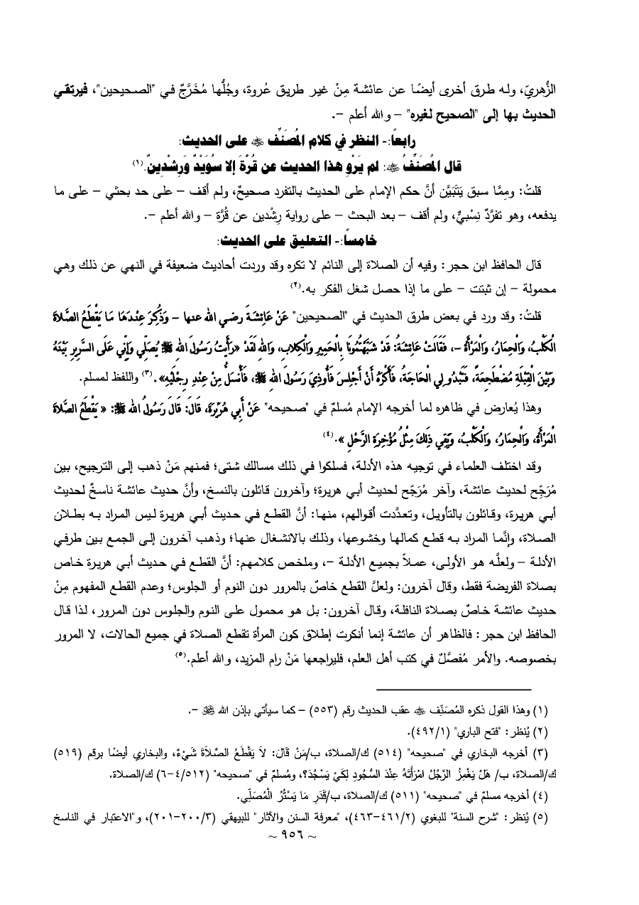 وقد اختلف العلماء في توجيه هذه الأدلة، فسلكوا في ذلك مسالك شتى؛ فمنهم مَنْ ذهب إلى الترجيح، بين مُرَجِّح لحديث عائشة، وآخر مُرَجّح لحديث أبي هريرة؛ وآخرون قائلون بالنسخ، وأنَّ حديث عائشة ناسخٌ لحديث أبي هريرة، وقائلون بالتأويل، وتعدَّدت أقوالهم، منها: أنَّ القطع في حديث أبي هريرة ليس المراد به بطلان الصلاة، وإنَّما المراد به قطع كمالها وخشوعها، وذلك بالانشغال عنها؛ وذهب آخرون إلى الجمع بين طرفي الأدلة - ولعلَّه هو الأولى، عملاً بجميع الأدلة -، وملخص كلامهم: أنَّ القطع في حديث أبي هريرة خاص بصلاة الفريضة فقط، وقال آخرون: ولعلَّ القطع خاصٌ بالمرور دون النوم أو الجلوس؛ وعدم القطع المفهوم مِنْ حديث عائشة خاصٌ بصلاة النافلة، وقال آخرون: بل هو محمول على النوم والجلوس دون المرور، لذا قال الحافظ ابن حجر: فالظاهر أن عائشة إنما أنكرت إطلاق كون المرأة تقطع الصلاة في جميع الحالات، لا المرور بخصوصه. والأمر مُفصَّلٌ في كتب أهل العلم، فليراجعها مَنْ رام المزيد، والله أعلم. (¬٥)