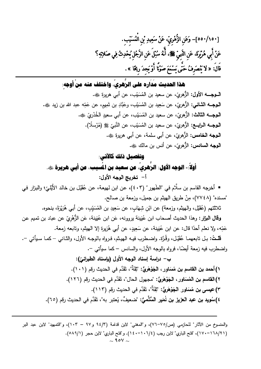 أولاً: - الوجه الأول: الزُّهريّ، عن سعيد بن المُسيب، عن أبي هريرة - رضي الله عنه -.