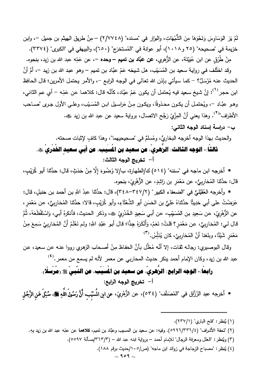 وقد اختُلف في رواية سعيد بن المُسَيّب، هل شيخه عَمّ عبَّاد بن تميم - وهو عبد الله بن زيد -، أمَّ أنَّ الحديث عنه مُرْسَلٌ؟ - كما سيأتي بإذن الله تعالى في الوجه الرابع -، والأمر يحتمل الأمرين؛ قال الحافظ ابن حجر (¬١): إنَّ شيخ سعيد فيه يُحتمل أن يكون عَمّ عبَّاد، كأنَّه قال: كلاهما عن عَمِّه - أي عم الثاني، وهو عبَّاد -، ويُحتمل أن يكون محذوفًا، ويكون مِنْ مَراسيل ابن المُسَيّب، وعلى الأول جرى "صاحب الأطراف" (¬٢). وهذا يعني أنَّ المِزِّيّ رَجَّح الاتصال، برواية سعيد عن عبد الله بن زيد - رضي الله عنه -.
