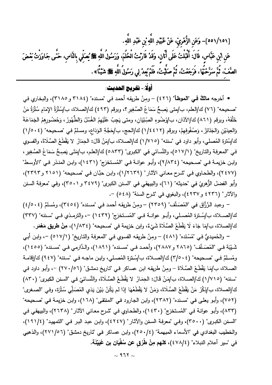 • أخرجه مالكٌ في "الموطأ" (٤٢٦) - ومِنْ طريقه أحمد في "مسنده" (٣١٨٤ و ٣١٨٥)، والبخاري في "صحيحه" (٧٦) ك/العلم، ب/متى يَصِحُّ سَمَاعُ الصَّغِيرِ؟، وبرقم (٤٩٣) ك/الصلاة، ب/سُتْرَةُ الإِمَامِ سُتْرَةُ مَنْ خَلْفَهُ، وبرقم (٨٦١) ك/الآذان، ب/وُضُوءِ الصِّبْيَانِ، ومتى يَجِبُ عَلَيْهِمُ الغُسْلُ وَالطُّهُورُ، وَحُضُورِهِمُ الجَمَاعَةَ وَالعِيدَيْنِ وَالجَنَائِزَ، وَصُفُوفِهِمْ، وبرقم (٤٤١٢/ ١) ك/الحج، ب/حَجَّةِ الوَدَاعِ، ومسلمٌ في "صحيحه" (٥٠٤/ ١) ك/سُترة المُصلي، وأبو داود في "سننه" (٧١٥/ ١) ك/الصلاة، ب/مَنْ قَالَ: الحِمَارُ لا يَقْطَعُ الصَّلَاةَ، والفسوي في "المعرفة والتاريخ" (١/ ٥١٧)، والنَّسائي في "الكبرى" (٥٨٣٣) ك/العلم، ب/مَتَى يَصِحُّ سَمَاعُ الصَّغِيرِ، وابن خزيمة في "صحيحه" (٨٣٤/ ٢)، وأبو عوانة في "المُستخرَج" (١٤٣١)، وابن المنذر في "الأوسط" (٢٤٧٧)، والطحاوي في "شرح معاني الآثار" (٢٦٣٩/ ١)، وابن حبَّان في "صحيحه" (٢١٥١ و ٢٣٩٣)، وأبو الفضل الزُّهريّ في "حديثه" (٦١)، والبيهقي في "السنن الكبرى" (٣٤٧٩ و ٣٥٠١)، وفي "معرفة السنن والآثار" (٤٢٣٦ و ٤٢٣٧)، والبغوي في "شرح السنة" (٥٤٨) -.