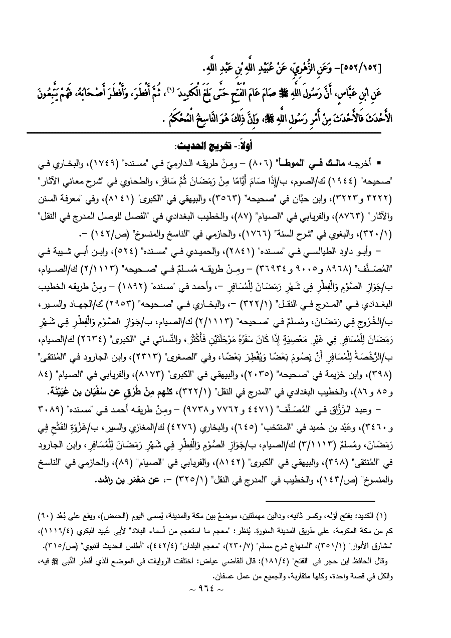 • أخرجه مالك في "الموطأ" (٨٠٦) - ومِنْ طريقه الدارميّ في "مسنده" (١٧٤٩)، والبخاري في "صحيحه" (١٩٤٤) ك/الصوم، ب/إِذَا صَامَ أَيَّامًا مِنْ رَمَضَانَ ثُمَّ سَافَرَ، والطحاوي في "شرح معاني الآثار" (٣٢٢٢ و ٣٢٢٣)، وابن حبَّان في "صحيحه" (٣٥٦٣)، والبيهقي في "الكبرى" (٨١٤١)، وفي "معرفة السنن والآثار" (٨٧٦٣)، والفريابي في "الصيام" (٨٧)، والخطيب البغدادي في "الفصل للوصل المدرج في النقل" (١/ ٣٢٠)، والبغوي في "شرح السنة" (١٧٦٦)، والحازمي في "الناسخ والمنسوخ" (ص/١٤٢) -.