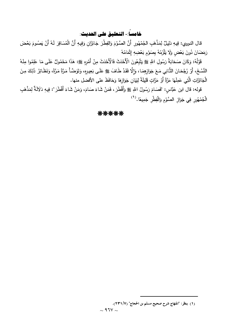 قال النووي: فِيهِ دَلِيلٌ لِمَذْهَبِ الجُمْهُورِ أَنَّ الصَّوْمَ وَالفِطْرَ جَائِزَانِ وَفِيهِ أَنَّ الْمُسَافِرَ لَهُ أَنْ يَصُومَ بَعْضَ رَمَضَانَ دُونَ بَعْضٍ وَلَا يَلْزَمُهُ بِصَوْمِ بَعْضِهِ إِتْمَامُهُ