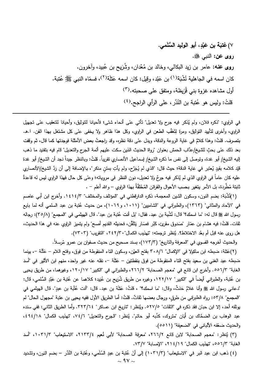 (¬٤) ذهب ابن عبد البر في "الاستيعاب" (٣/ ١٠٣١) إلى أنّ عُتبة بن عبدٍ السُلَمي، وعُتبة بن النُدَّر - بضم النون، وتشديد الدال المفتوحة، كما في "الإصابة" ٧/ ٨١ - شخصٌ واحدٌ، واستدلّ على ذلك بأن خالد بن مُعْدان قد روى عنهما معاً، وأنهما سُلَمِيّان؛ بينما فرَّق بينهما ابن الأثير في "أسد الغابة" فترجم لعُتبة بن عَبْدٍ في (٣/ ٥٥٦)، وترجم لعتبة بن النُدَّر في (٣/ ٥٦٣)، ونقل قوله، وقال: هذا كلام ابن عبد البر، وهو يميل إلى أنهما واحدٌ. ونقل المزي كلام ابن عبد البر في "التهذيب" (١٩/ ٣٢٥)، وتعقّبه بقوله: هكذا قال، ولم نجد أحداً تابعه عليه، والصواب ما ذكره غير واحد أنهما اثنان. وتعقبه أيضاً الحافظ في "الإصابة" (٧/ ٨٢) فقال: والصواب أنهما اثنان، ثم فنّد حجة ابن عبد البر بقوله: وهذه حجة واهية؛ فقد قال محمد بن الربيع لمّا ذكر حديث عُلَيّ بن رَباح، عن عُتبة بن النُّدَّر: وروى عنه من أهل الشام خالد بن مُعدان، ولا يلزم من روايته عن عُتبة بن عبد، أن يكون هو عتبة بن النُدَّر. ا. هـ بتصرف، لذا فرّق بينهما ابن حجر، فترجم لابن عَبْدٍ في (٧/ ٧٣)، ولابن النُدّر في (٧/ ٨١).
