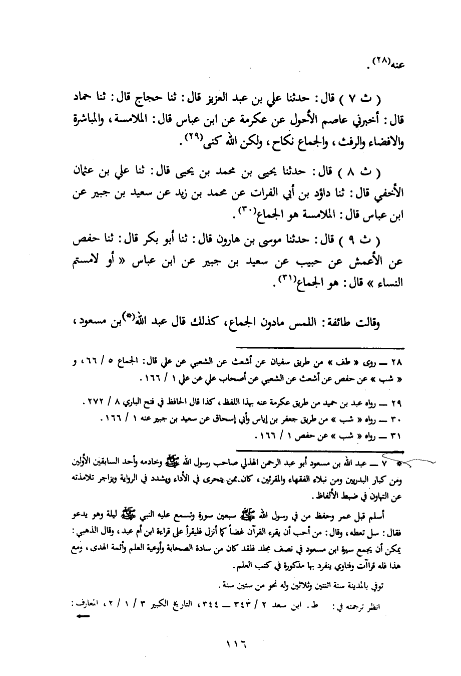 9 - قَالَ: حَدَّثَنَا مُوسَى بْنُ هَارُونَ، قَالَ: ثنا أَبُو بَكْرٍ، قَالَ: ثنا حَفْصٌ، عَنِ الْأَعْمَشِ، عَنْ حَبِيبٍ، عَنْ سَعِيدِ بْنِ جُبَيْرٍ، عَنِ ابْنِ عَبَّاسٍ، {أَوْ لَامَسْتُمُ النِّسَاءَ} [النساء: 43] قَالَ: «هُوَ الْجِمَاعُ» وَقَالَتْ طَائِفَةٌ: اللَّمْسُ مَا دُونَ الْجِمَاعِ، كَذَلِكَ قَالَ عَبْدُ اللهِ بْنُ مَسْعُودٍ -[117]- وَقَالَ عَبْدُ اللهِ بْنُ عُمَرَ: مَنْ قَبَّلَ امْرَأَتَهُ أَوْ جَسَّهَا بِيَدِهِ فَعَلَيْهِ الْوُضُوءُ