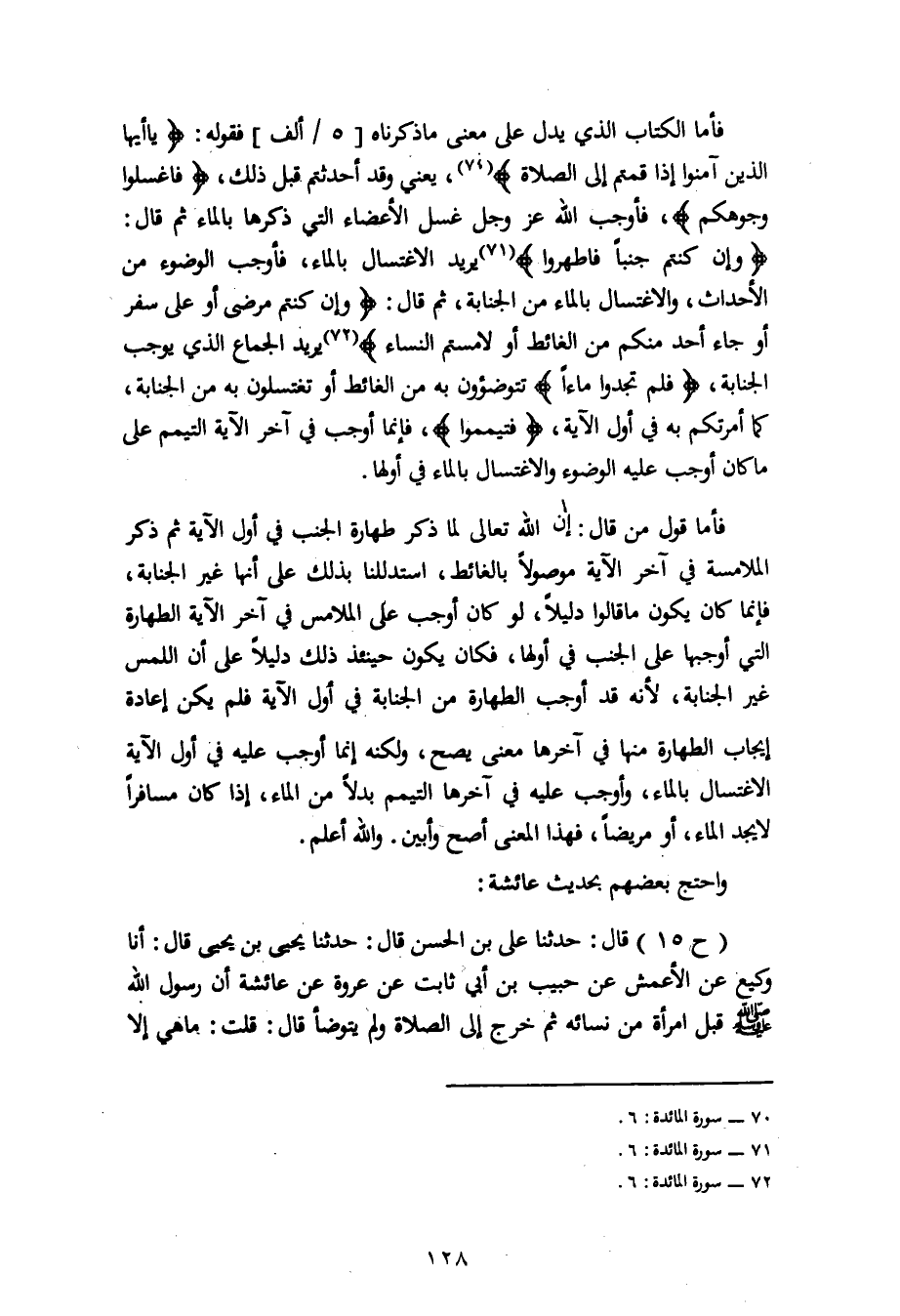 15 - قَالَ: حَدَّثَنَا عَلَى بْنُ الْحَسَنِ، قَالَ: حَدَّثَنَا يَحْيَى بْنُ يَحْيَى، قَالَ: أنا وَكِيعٌ، عَنِ الْأَعْمَشِ، عَنْ حَبِيبِ بْنِ أَبِي ثَابِتٍ، عَنْ عُرْوَةَ، عَنْ عَائِشَةَ، أَنَّ رَسُولَ اللهِ صَلَّى اللَّهُ عَلَيْهِ وَسَلَّمَ قَبَّلَ امْرَأَةً مِنْ نِسَائِهِ ثُمَّ خَرَجَ إِلَى الصَّلَاةِ وَلَمْ يَتَوَضَّأْ قَالَ: قُلْتُ: مَا هِيَ إِلَّا -[129]- أَنْتِ فَضَحِكَتْ. قَالَ أَبُو بَكْرٍ: وَيُقَالُ إِنَّ حَبِيبَ بْنَ أَبِي ثَابِتٍ لَمْ يَسْمَعْ مِنْ عُرْوَةَ شَيْئًا. وَقَالَ بَعْضُهُمْ: لِلْمُلَامَسَةِ نَظَائِرُ فِي الْكِتَابِ مِنْ ذَلِكَ الْمُبَاشَرَةُ وَاللَّمْسُ وَالْمَسُّ وَاحِدٌ فِي الْمَعْنَى قَالَ اللهُ تَعَالَى: {لَا جُنَاحَ عَلَيْكُمْ إِنْ طَلَّقْتُمُ النِّسَاءَ مَا لَمْ تَمَسُّوهُنَّ} [البقرة: 236] الْآيَةَ وَقَالَ: {إِذَا نَكَحْتُمُ الْمُؤْمِنَاتِ ثُمَّ طَلَّقْتُمُوهُنَّ مِنْ قَبْلِ أَنْ تَمَسُّوهُنَّ} [الأحزاب: 49] وَقَالَ: {وَإِنْ طَلَّقْتُمُوهُنَّ مِنْ قَبْلِ أَنْ تَمَسُّوهُنَّ وَقَدْ فَرَضْتُمْ لَهُنَّ فَرِيضَةً} [البقرة: 237] فَذَكَرَ جَلَّ ذِكْرُهُ الْمَسِيسَ فِي هَذِهِ الْآيَاتِ وَاللَّمْسَ وَالْمَسَّ وَالْمُلَامَسَةَ وَالْمُمَاسَّةَ. وَقَدْ أَجْمَعَ أَهْلُ الْعِلْمِ عَلَى أَنَّ رَجُلًا لَوْ تَزَوَّجَ امْرَأَةً ثُمَّ مَسَّهَا بِيَدِهِ أَوْ قَبَّلَهَا بِحَضْرَةِ جَمَاعَةٍ وَلَمْ يَخْلُ بِهَا فَطَلَّقَهَا أَنَّ لَهَا نِصْفَ الصَّدَاقِ إِنْ كَانَ سَمَّى لَهَا صَدَاقًا وَالْمُتْعَةَ إِنْ لَمْ يَكُنْ سَمَّى لَهَا صَدَاقًا وَلَا عِدَّةَ عَلَيْهَا، فَدَلَّ إِجْمَاعُهُمْ عَلَى ذَلِكَ أَنَّ اللهَ إِنَّمَا أَرَادَ فِي هَذِهِ الْآيَاتِ الْجِمَاعَ، فَإِذَا كَانَ كَذَلِكَ حَكَمْنَا اللَّمْسَ بِحُكْمِ الْمَسِّ إِذَا كَانَا فِي الْمَعْنَى وَاحِدًا. -[130]- قَالَ أَبُو بَكْرٍ: وَقَدْ أَجْمَعَ كُلُّ مَنْ حُفِظَ عَنْهُ مِنْ أَهْلِ الْعِلْمِ عَلَى أَنْ لَا وُضُوءَ عَلَى الرَّجُلِ إِذَا قَبَّلَ أُمَّهُ أَوِ ابْنَتَهُ أَوْ أُخْتَهُ إِكْرَامًا لَهُنَّ وَبِرًّا عِنْدَ قَدُومٍِ مِنْ سَفَرٍ أَوْ مَسَّ بَعْضُ بَدَنِهِ بَعْضَ بَدَنِهَا عِنْدَ مُنَاوَلَةِ شَيْءٍ إِنْ نَاوَلَهَا إِلَّا مَا ذُكِرَ مِنْ أَحَدِ قَوْلَيِ الشَّافِعِيِّ فَإِنَّ بَعْضَ الْمِصْرِيِّينَ مِنْ أَصْحَابِهِ حَكَى عَنْهُ فِي الْمَسْأَلَةِ قَوْلَيْنِ: أَحَدُهُمَا إِيجَابُ الْوُضُوءِ مِنْهُ، وَالْآخَرُ كَقَوْلِ سَائِرِ أَهْلِ الْعِلْمِ وَلَمْ أَجِدْ هَذِهِ الْمَسْأَلَةَ فِي كُتُبِهِ الْمِصْرِيَّةِ الَّتِي قَرَأْنَاهَا عَلَى الرَّبِيعِ وَلَسْتُ أَدْرِي أَيَثْبُتُ ذَلِكَ عَنِ الشَّافِعِيِّ أَمْ لَا لِأَنَّ الَّذِي حَكَاهُ لَمْ يَذْكُرْ أَنَّهُ سَمِعَهُ مِنْهُ وَلَوْ ثَبَتَ ذَلِكَ عَنْهُ لَكَانَ قَوْلُهُ الَّذِي يُوَافِقُ فِيهِ الْمَدَنِيَّ وَالْكُوفِيَّ وَسَائِرَ أَهْلِ الْعِلْمِ أَوْلَى بِهِ وَقَدْ ثَبَتَ أَنَّ نَبِيَّ اللهِ صَلَّى اللَّهُ عَلَيْهِ وَسَلَّمَ صَلَّى وَهُوَ حَامِلٌ أُمَامَةَ بِنْتَ أَبِي الْعَاصِ