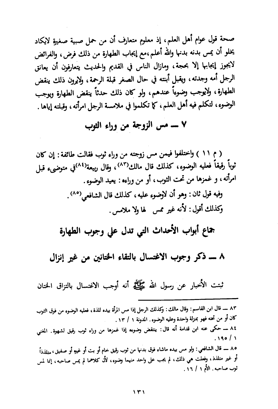 مَسُّ الزَّوْجَةِ مِنْ وَرَاءِ الثَّوْبِ وَاخْتَلَفُوا فِيمَنْ مَسَّ زَوْجَتَهُ مِنْ وَرَاءِ ثَوْبٍ فَقَالَتْ طَائِفَةٌ: إِنْ كَانَ ثَوْبًا رَقِيقًا فَعَلَيْهِ الْوُضُوءُ، كَذَلِكَ قَالَ مَالِكٌ. وَقَالَ رَبِيعَةُ فِي مُتَوَضِّئٍ قَبَّلَ امْرَأَتَهُ وَغَمَزَهَا مِنْ تَحْتِ الثَّوْبِ أَوْ مِنْ وَرَائِهِ: يُعِيدُ الْوُضُوءَ. وَفِيهِ قَوْلٌ ثَانٍ وَهُوَ أَنْ لَا وُضُوءَ عَلَيْهِ كَذَلِكَ قَالَ الشَّافِعِيُّ وَكَذَلِكَ أَقُولُ لِأَنَّهُ غَيْرُ مُمِسٍّ لَهَا وَلَا مُلَامِسٍ.