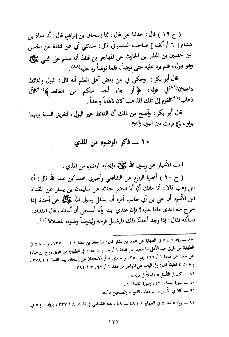 19 - قَالَ: حَدَّثَنَا عَلِيٌّ، قَالَ: ثنا إِسْحَاقُ بْنُ إِبْرَاهِيمَ، قَالَ: أنا مُعَاذُ بْنُ هِشَامٍ صَاحِبُ الدَّسْتُوَائِيِّ قَالَ: حَدَّثَنِي أَبِي، عَنْ قَتَادَةَ، عَنِ الْحَسَنِ، عَنْ حُصَيْنِ بْنِ الْمُنْذِرِ بْنِ الْحَارِثِ، عَنِ الْمُهَاجِرِ بْنِ قُنْفُذٍ، أَنَّهُ سَلَّمَ عَلَى النَّبِيِّ صَلَّى اللَّهُ عَلَيْهِ وَسَلَّمَ وَهُوَ يَبُولُ فَلَمْ يَرُدَّ عَلَيْهِ حَتَّى تَوَضَّأَ فَلَمَّا تَوَضَّأَ رَدَّ عَلَيْهِ قَالَ أَبُو بَكْرٍ: وَحُكِيَ لِي عَنْ بَعْضِ أَهْلِ الْعِلْمِ أَنَّهُ قَالَ: الْبَوْلُ وَالْغَائِطُ دَاخِلَانِ فِي قَوْلِهِ {أَوْ جَاءَ أَحَدٌ مِنْكُمْ مِنَ الْغَائِطِ} [النساء: 43] لِأَنَّ ذَهَابَ الْقَوْمِ إِلَى تِلْكَ الْمَذَاهِبِ كَانَ ذَهَابًا وَاحِدًا. قَالَ أَبُو بَكْرٍ: وَأَصَحُّ مِنْ ذَلِكَ أَنَّ الْغَائِطَ غَيْرُ الْبَوْلِ لِتَفْرِيقِ السُّنَّةِ بَيْنَهُمَا بِوَاوٍ وَكَمَا فَرَّقَتْ بَيْنَ الْبَوْلِ وَالنَّوْمِ