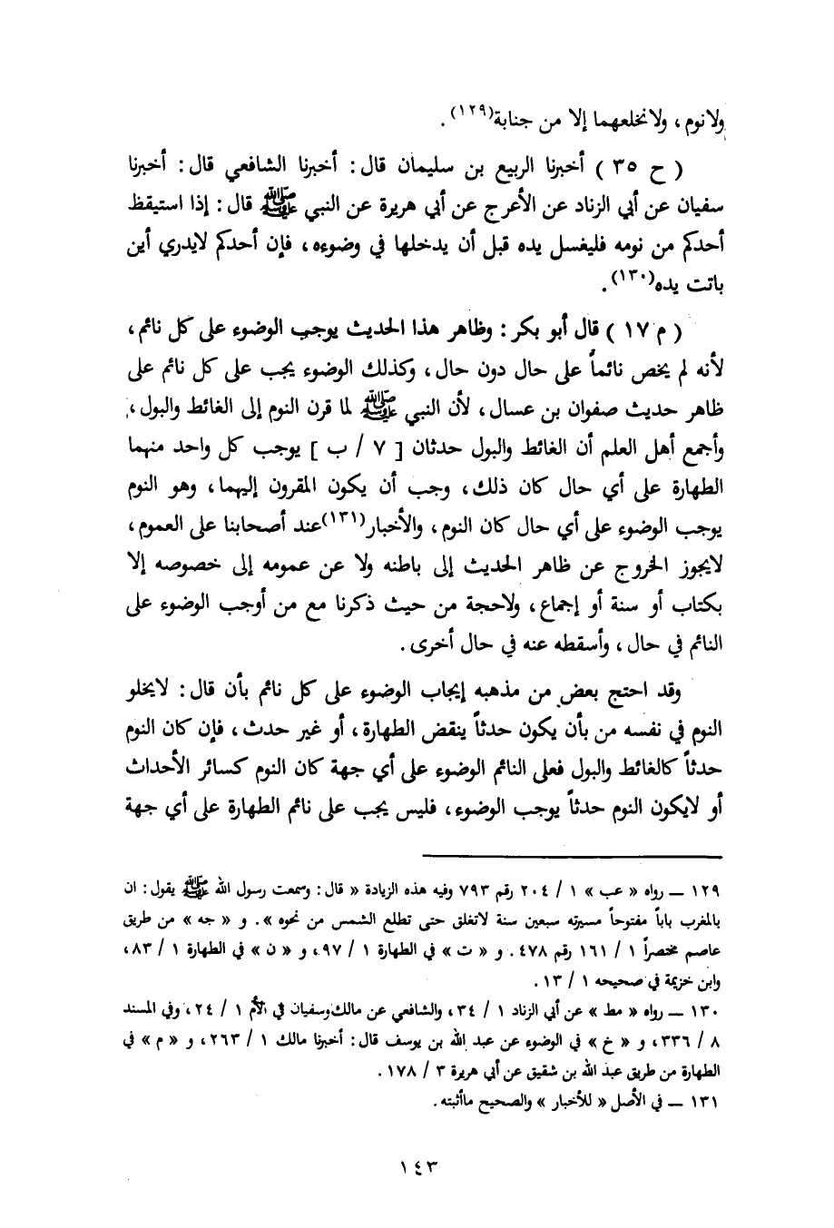 35 - أَخْبَرَنَا الرَّبِيعُ بْنُ سُلَيْمَانَ، قَالَ: أَخْبَرَنَا الشَّافِعِيُّ، قَالَ: أَخْبَرَنَا سُفْيَانُ، عَنْ أَبِي الزِّنَادِ، عَنِ الْأَعْرَجِ، عَنْ أَبِي هُرَيْرَةَ، عَنِ النَّبِيِّ صَلَّى اللَّهُ عَلَيْهِ وَسَلَّمَ: «إِذَا اسْتَيْقَظَ أَحَدُكُمْ مِنْ نَوْمِهِ فَلْيَغْسِلْ يَدَهُ قَبْلَ أَنْ يُدْخِلَهَا فِي وَضُوئِهِ فَإِنَّ أَحَدَكُمْ لَا يَدْرِي أَيْنَ بَاتَتْ يَدُهُ» . قَالَ أَبُو بَكْرٍ: وَظَاهِرُ هَذَا الْحَدِيثِ يُوجِبُ الْوُضُوءَ عَلَى كُلِّ نَائِمٍ لِأَنَّهُ لَمْ يَخُصَّ نَائِمًا عَلَى حَالٍ دُونَ حَالٍ وَكَذَلِكَ الْوُضُوءُ يَجِبُ عَلَى كُلِّ نَائِمٍ عَلَى ظَاهِرِ حَدِيثِ صَفْوَانَ بْنِ عَسَّالٍ لِأَنَّ النَّبِيَّ صَلَّى اللَّهُ عَلَيْهِ وَسَلَّمَ لَمَّا قَرَنَ النَّوْمَ إِلَى الْغَائِطِ وَالْبَوْلِ وَأَجْمَعَ أَهْلُ الْعِلْمِ أَنَّ الْغَائِطَ وَالْبَوْلَ حَدَثَانِ يُوجِبُ كُلُّ وَاحِدٍ مِنْهُمَا الطَّهَارَةَ عَلَى أَيِّ حَالٍ كَانَ ذَلِكَ، وَجَبَ أَنْ يَكُونَ الْمَقْرُونُ إِلَيْهِمَا وَهُوَ النَّوْمُ يُوجِبُ الْوُضُوءَ عَلَى أَيِّ حَالٍ كَانَ النَّوْمُ، وَالْأَخْبَارُ عِنْدَ أَصْحَابِنَا عَلَى الْعُمُومِ لَا يَجُوزُ الْخُرُوجُ عَنْ ظَاهِرِ الْحَدِيثِ إِلَى بَاطِنِهِ وَلَا عَنْ عُمُومِهِ إِلَى خُصُوصِهِ إِلَّا بِكِتَابٍ أَوْ سُنَّةٍ أَوْ إِجْمَاعٍ، وَلَا حُجَّةٍ مِنْ حَيْثُ ذَكَرْنَا مَعَ مَنْ أَوْجَبَ الْوُضُوءَ عَلَى النَّائِمِ فِي حَالٍ وَأَسْقَطَهُ عَنْهُ فِي حَالٍ أُخْرَى. وَقَدِ احْتَجَّ بَعْضُ مَنْ مَذْهَبُهُ إِيجَابُ الْوُضُوءِ عَلَى كُلِّ نَائِمٍ بِأَنْ قَالَ: لَا يَخْلُو النَّوْمُ فِي نَفْسِهِ مِنْ أَنْ يَكُونَ حَدَثًا يَنْقُضُ الطَّهَارَةَ، أَوْ غَيْرَ حَدَثٍ فَإِنْ كَانَ النَّوْمُ حَدَثًا كَالْغَائِطِ وَالْبَوْلِ فَعَلَى النَّائِمِ الْوُضُوءُ عَلَى أَيِّ جِهَةٍ كَانَ النَّوْمُ كَسَائِرِ الْأَحْدَاثِ أَوْ لَا يَكُونُ النَّوْمُ حَدَثًا يُوجِبُ الْوُضُوءَ فَلَيْسَ يَجِبُ عَلَى نَائِمٍ الطَّهَارَةُ عَلَى أَيِّ جِهَةٍ -[144]- كَانَ النَّوْمُ مِنْهُ حَتَّى يَكُونَ مَعَهُ حَدَثٌ يُوجِبُ الْوُضُوءَ. وَاحْتَجَّ بِجِهَةٍ أُخْرَى وَهُوَ أَنَّ أَهْلَ الْعِلْمِ مُجْمِعُونَ عَلَى إِيجَابِ الْوُضُوءِ عَلَى مَنْ زَالَ عَقْلُهُ بِجُنُونٍ أَوْ أُغْمِيَ بِمَرَضٍ إِذَا أَفَاقَ عَلَى أَيِّ حَالٍ كَانَ ذَلِكَ مِنْهُ قَالَ: فَكَذَلِكَ النَّائِمُ عَلَيْهِ مَا عَلَى الْمُغْمَى عَلَيْهِ لِأَنَّهُ زَائِلُ الْعَقْلِ. مَعَ أَنَّ الْأَخْبَارَ مُسْتَغْنًى بِهَا عَنْ كُلِّ قَوْلٍ وَقَدِ احْتَجَّ بَعْضُهُمْ بِظَاهِرِ حَدِيثِ عَلِيِّ بْنِ أَبِي طَالِبٍ وَمُعَاوِيَةَ بْنِ أَبِي سُفْيَانَ عَنِ النَّبِيِّ صَلَّى اللَّهُ عَلَيْهِ وَسَلَّمَ أَنَّهُ قَالَ: «إِنَّمَا الْعَيْنُ وِكَاءُ السَّهِ فَمَنْ نَامَ فَلْيَتَوَضَّأْ»