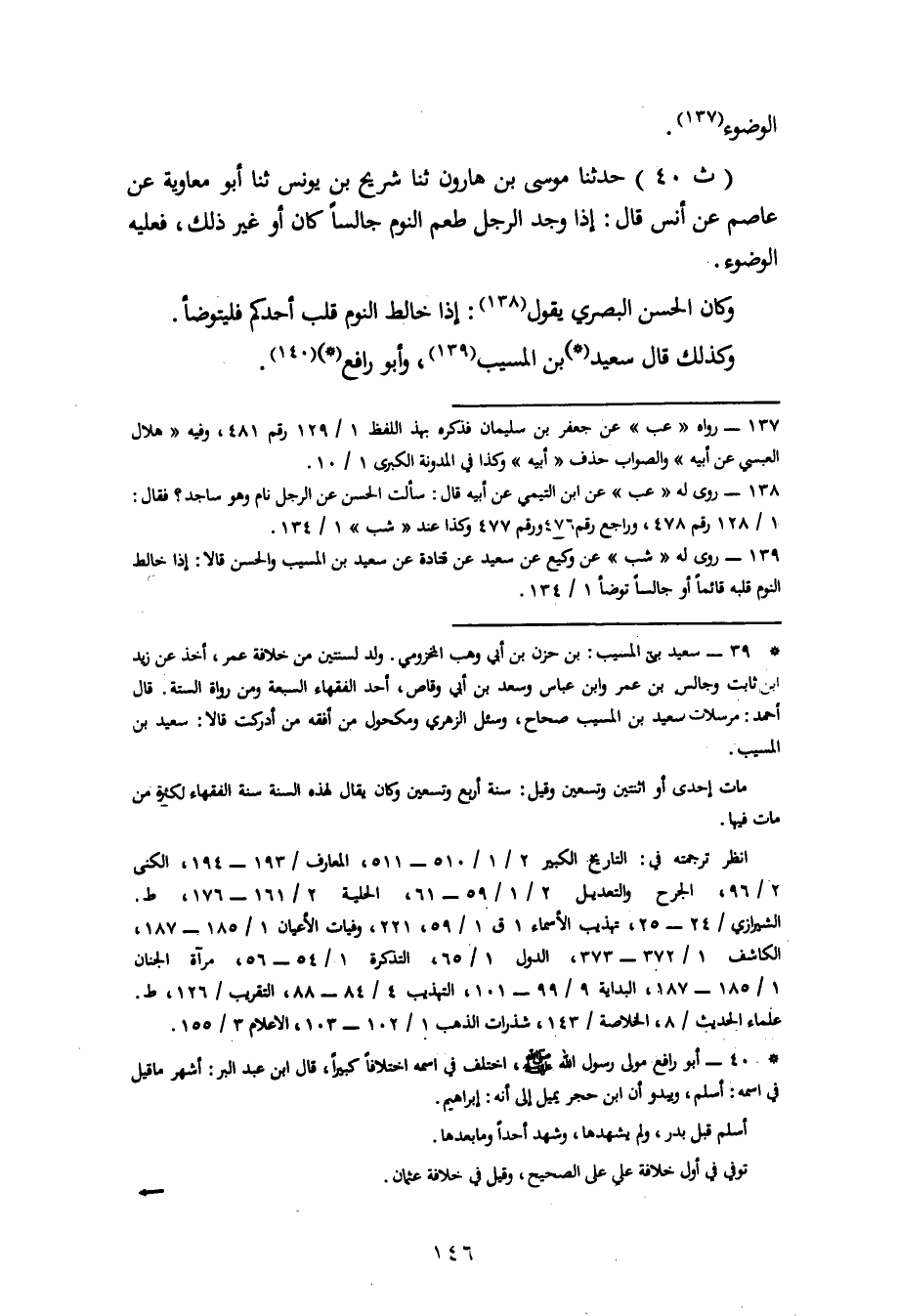 40 - حَدَّثَنَا مُوسَى بْنُ هَارُونَ، ثنا سُرَيْجُ بْنُ يُونُسَ، ثنا أَبُو مُعَاوِيَةَ، عَنْ عَاصِمٍ، عَنْ أَنَسٍ، قَالَ: إِذَا وَجَدَ الرَّجُلُ طَعْمَ النَّوْمِ جَالِسًا كَانَ أَوْ غَيرَ ذَلِكَ فَعَلَيْهِ الْوُضُوءُ. وَكَانَ الْحَسَنُ الْبَصْرِيُّ يَقُولُ: إِذَا خَالَطَ النَّوْمُ قَلْبَ أَحَدِكُمْ فَلْيَتَوَضَّأْ. وَكَذَلِكَ قَالَ سَعِيدُ بْنُ الْمُسَيِّبِ وَأَبُو رَافِعٍ. -[147]- وَقَالَ عَطَاءُ بْنُ أَبِي رَبَاحٍ: إِذَا مَلَكَكَ النَّوْمُ فَتَوَضَّأْ قَاعِدًا أَوْ مُضْطَجِعًا. وَرُوِّينَا عَنْ عَطَاءٍ وَطَاوُسٍ وَمُجَاهِدٍ أَنَّهُمْ قَالُوا: مَنْ نَامَ رَاكِعًا أَوْ سَاجِدًا فَلْيَتَوَضَّأْ. وَقَالَ إِسْحَاقُ: كُلَّمَا نَامَ حَتَّى غَلَبَهُ عَلَى عَقْلِهِ تَوَضَّأَ. وَبِهِ قَالَ الْقَاسِمُ بْنُ سَلَّامٍ. -[148]- وَقَالَتْ فِرْقَةٌ: إِنْ نَامَ قَلِيلًا لَمْ يُنْتَقَضْ وُضُوءُهُ وَإِنْ تَطَاوَلَ ذَلِكَ تَوَضَّأْ، هَذَا قَوْلُ مَالِكِ بْنِ أَنَسٍ وَبِهِ قَالَ الزُّهْرِيُّ وَرَبِيعَةُ. وَقَالَ الْأَوْزَاعِيُّ: إِذَا اسْتَثْقَلَ نَوْمًا قَاعِدًا تَوَضَّأَ فَأَمَّا مَنْ كَانَ نَوْمُهُ غِرَارًا كَمَا قَالَ الزُّهْرِيُّ يَنَامُ وَيَسْتَيْقِظُ فَلَا وُضُوءَ عَلَيْهِ. وَقَالَ أَحْمَدُ بْنُ حَنْبَلٍ: النَّائِمُ قَاعِدًا إِذَا أَطَالَ النَّوْمَ تَوَضَّأَ. وَقَالَتْ فِرْقَةٌ ثَالِثَةٌ: لَا يَجِبُ عَلَى النَّائِمِ الْوُضُوءُ حَتَّى يَضَعَ جَنْبَهُ، هَذَا قَوْلُ الْحَكَمِ وَحَمَّادٍ وَسُفْيَانَ الثَّوْرِيِّ وَقَالَ الثَّوْرِيُّ: إِنْ نَامَ قَائِمًا أَمْ قَاعِدًا لَمْ يُعِدْ وُضُوءَهُ. وَقَالَ أَصْحَابُ الرَّأْيِ فِي النَّوْمِ إِذَا كَانَ قَائِمًا أَوْ رَاكِعًا أَوْ سَاجِدًا أَوْ قَاعِدًا فَلَا يُنْتَقَضُ ذَلِكَ الْوُضُوءُ، فَأَمَّا إِذَا نَامَ مُضْطَجِعًا أَوْ مُتَّكِئًا فَإِنَّ ذَلِكَ يَنْقُضُ الْوُضُوءَ، وَقَالَ يَعْقُوبُ كَذَلِكَ إِلَّا فِي السَّاجِدِ فِي الصَّلَاةِ فَإِنَّهُ زَعَمَ أَنَّهُ إِنْ -[149]- تَعَمَّدَ النَّوْمَ وَهُوَ سَاجِدٌ وَجَبَ عَلَيْهِ الْوُضُوءُ، وَفَسَدَتْ صَلَاتُهُ وَإِنْ غَلَبَهُ النَّوْمُ فَلَا وُضُوءَ عَلَيْهِ. وَاحْتَجَّ بَعْضُهُمْ بِحَدِيثٍ رُوِيَ عَنِ ابْنِ عَبَّاسٍ لَا يَثْبُتُ مِنْ حَدِيثِ أَبِي خَالِدٍ الدَّالَانِيِّ وَقَدْ ذَكَرْتُهُ وَعِلَلَهُ فِي الْكِتَابِ الَّذِي اخْتَصَرْتُ مِنْهُ هَذَا الْكِتَابَ، وَمِمَّنْ رُوِيَ عَنْهُ أَنَّهُ كَانَ يَنَامُ قَاعِدًا وَلَا يَتَوَضَّأُ ابْنُ عُمَرَ وَأَبُو أُمَامَةَ الْبَاهِلِيُّ -[150]- وَإِبْرَاهِيمُ النَّخَعِيُّ وَابْنُ سِيرِينَ وَسَالِمُ بْنُ عَبْدِ اللهِ وَمُحَمَّدُ بْنُ -[151]- عَلِيٍّ وَنَافِعً، وَحُكِيَ عَنِ ابْنِ الْمُبَارَكِ أَنَّهُ كَانَ يَقُولُ فِيمَنْ نَامَ وَهُوَ قَاعِدٌ مُسْتَنِدٌ: لَا وُضَوْءَ عَلَيْهِ