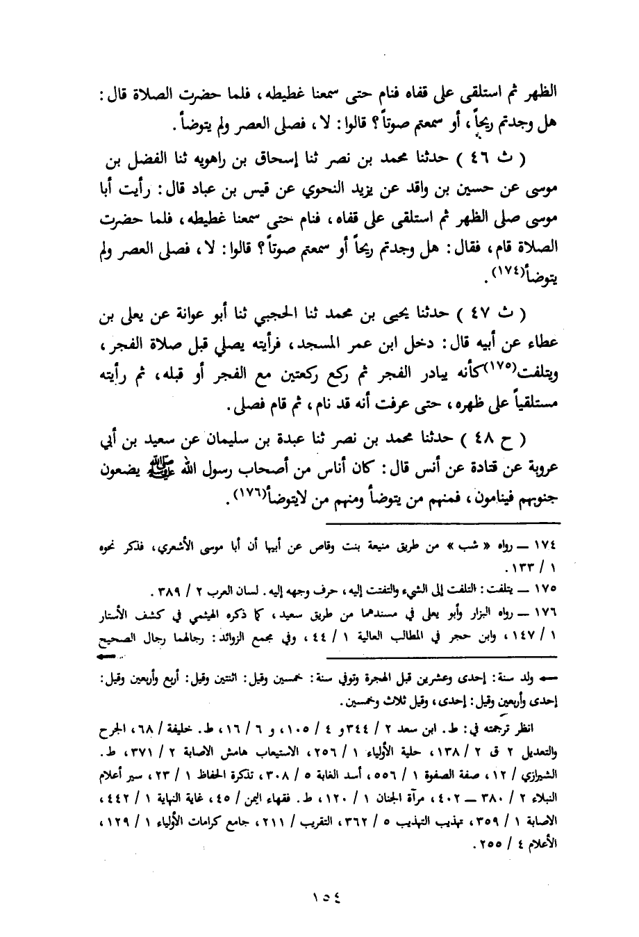 48 - حَدَّثَنَا مُحَمَّدُ بْنُ نَصْرٍ، ثنا عَبْدَةُ بْنُ سُلَيْمَانَ، عَنْ سَعِيدِ بْنِ أَبِي عَرُوبَةَ، عَنْ قَتَادَةَ، عَنْ أَنَسٍ، قَالَ: كَانَ أُنَاسٌ مِنْ أَصْحَابِ رَسُولِ اللهِ صَلَّى اللَّهُ عَلَيْهِ وَسَلَّمَ يَضَعُونَ جُنُوبَهُمْ فَيَنَامُونَ فَمِنْهُمْ مَنْ يَتَوَضَّأُ، وَمِنْهُمْ مَنْ لَا يَتَوَضَّأُ. -[155]- وَرُوِّينَا عَنْ سَعِيدِ بْنِ الْمُسَيِّبِ أَنَّهُ كَانَ يَنَامُ مِرَارًا مُضْطَجِعًا يَنْتَظِرُ الصَّلَاةَ ثُمَّ يُصَلِّي، فَلَا يُعِيدُ الْوُضُوءَ. وَمِنْ حَدِيثِ يَعْلَى بْنِ عَطَاءٍ عَنْ أَبِيهِ أَنَّهُ قَالَ: رَأَيْتُ ابْنَ عُمَرَ مُسْتَلْقِيًا عَلَى ظَهْرِهِ حَتَّى عَرَفْتُ أَنَّهُ نَامَ ثُمَّ قَامَ فَصَلَّى