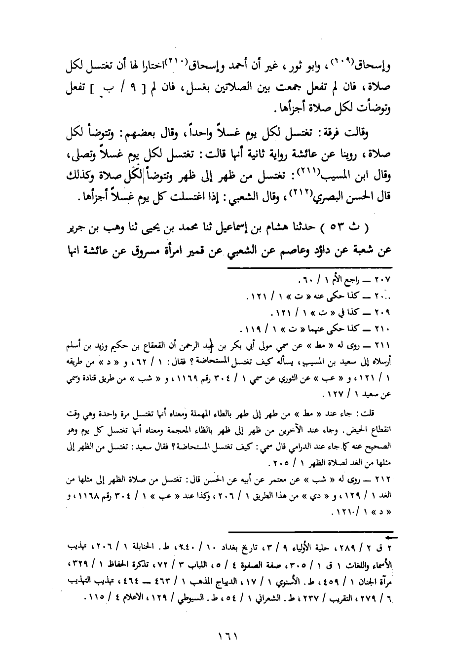 53 - حَدَّثَنَا هِشَامُ بْنُ إِسْمَاعِيلَ، ثنا مُحَمَّدُ بْنُ يَحْيَى، ثنا وَهْبُ بْنُ جَرِيرٍ، عَنْ شُعْبَةَ، عَنْ دَاوُدَ، وَعَاصِمٍ، عَنِ الشَّعْبِيِّ، عَنْ قُمَيْرَ امْرَأَةِ مَسْرُوقٍ، عَنْ عَائِشَةَ، أَنَّهَا -[162]- قَالَتْ فِي الْمُسْتَحَاضَةِ: تُمْسِكُ عَنِ الصَّلَاةِ أَيَّامَ أَقْرَائِهَا ثُمَّ تَغْتَسِلُ لِكُلِّ يَوْمٍ غُسْلًا وَتُصَلِّي وَقَالَتْ فِرْقَةٌ ثَالِثَةٌ: تَغْتَسِلُ لِكُلِّ صَلَاةٍ. رُوِيَ هَذَا الْقَوْلُ عَنْ عَلِيٍّ وَابْنِ عَبَّاسٍ وَابْنِ عُمَرَ وَابْنِ الزُّبَيْرِ