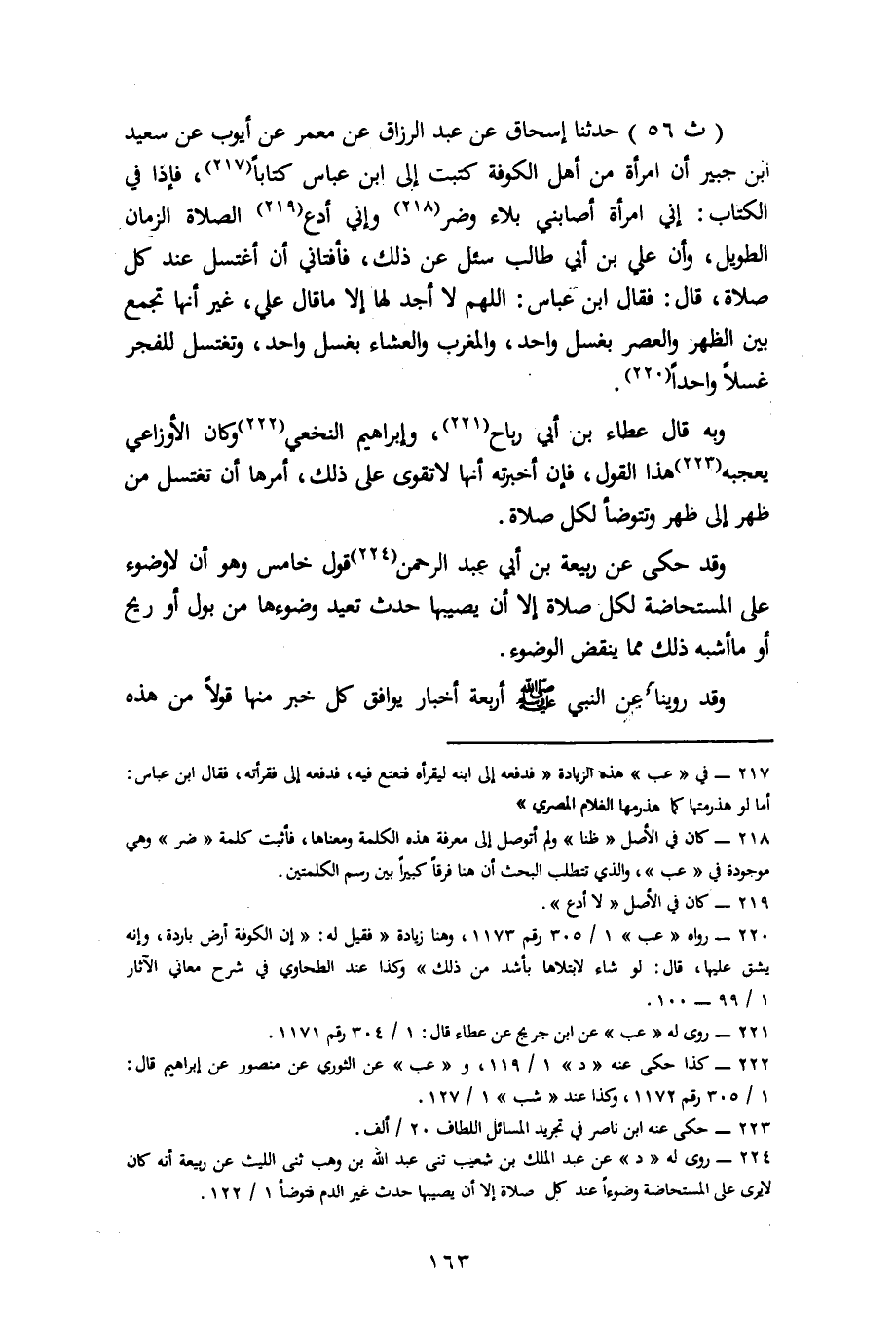 56 - حَدَّثَنَا إِسْحَاقُ، عَنْ عَبْدِ الرَّزَّاقِ، عَنْ مَعْمَرٍ، عَنْ أَيُّوبَ، عَنْ سَعِيدِ بْنِ جُبَيْرٍ، أَنَّ امْرَأَةً مِنْ أَهْلِ الْكُوفَةِ كَتَبَتْ إِلَى ابْنِ عَبَّاسٍ كِتَابًا فَإِذَا فِي الْكِتَابِ: إِنِّي امْرَأَةٌ أَصَابَنِي بَلَاءٌ وَضُرٌّ وَإِنِّي أَدَعُ الصَّلَاةَ الزَّمَانَ الطَّوِيلَ وَإِنَّ عَلِيَّ بْنَ أَبِي طَالِبٍ سُئِلَ عَنْ ذَلِكَ فَأَفْتَانِي أَنْ أَغْتَسِلَ عِنْدَ كُلَّ صَلَاةٍ قَالَ: فَقَالَ ابْنُ عَبَّاسٍ: اللهُمَّ لَا أَجِدُ لَهَا إِلَّا مَا قَالَ عَلِيٌّ غَيْرَ أَنَّهَا تَجْمَعُ بَيْنَ الظُّهْرِ وَالْعَصْرِ بِغُسْلٍ وَاحِدٍ، وَالْمَغْرِبِ وَالْعِشَاءِ بِغُسْلٍ وَاحِدٍ، وَتَغْتَسِلُ لِلْفَجْرِ غُسْلًا وَاحِدًا وَبِهِ قَالَ عَطَاءُ بْنُ أَبِي رَبَاحٍ وَإِبْرَاهِيمُ النَّخَعِيُّ، وَكَانَ الْأَوْزَاعِيُّ يُعْجِبُهُ هَذَا الْقَوْلُ فَإِنْ أَخْبَرَتْهُ أَنَّهَا لَا تَقْوَى عَلَى ذَلِكَ أَمَرَهَا أَنْ تَغْتَسِلَ مِنْ ظُهْرٍ إِلَى ظُهْرٍ، وَتَتَوَضَّأَ لِكُلِّ صَلَاةٍ. وَقَدْ حُكِيَ عَنْ رَبِيعَةَ بْنِ أَبِي عَبْدِ الرَّحْمَنِ قَوْلٌ خَامِسٌ وَهُوَ أَنْ لَا وُضُوءَ عَلَى الْمُسْتَحَاضَةِ لِكُلِّ صَلَاةٍ إِلَّا أَنْ يُصِيبَهَا حَدَثٌ تُعِيدُ وُضُوءَهَا مِنْ بَوْلٍ أَوْ رِيحٍ أَوْ مَا أَشْبَهَ ذَلِكَ مِمَّا يَنْقُضُ الْوُضُوءَ. وَقَدْ رُوِّينَا عَنِ النَّبِيِّ صَلَّى اللَّهُ عَلَيْهِ وَسَلَّمَ أَرْبَعَةَ أَخْبَارٍ يُوَافِقُ كُلُّ خَبَرٍ مِنْهَا قَوْلًا مِنْ هَذِهِ -[164]- الْأَقَاوِيلِ غَيْرَ قَوْلِ رَبِيعَةَ وَقَدْ تَكَلَّمَ فِي أَسَانِيدِهَا. وَالنَّظَرُ دَالٌّ عَلَى مَا قَالَ رَبِيعَةُ إِلَّا أَنَّهُ قَوْلٌ لَا أَعْلَمُ أَحَدًا سَبَقَهُ إِلَيْهِ وَإِنَّمَا قُلْتُ النَّظَرُ يَدُلُّ عَلَيْهِ لِأَنَّهُ لَا فَرْقَ بَيْنَ الدَّمِ الَّذِي يَخْرُجُ مِنَ الْمُسْتَحَاضَةِ قَبْلَ الْوُضُوءِ وَالَّذِي يَخْرُجُ فِي أَضْعَافِ الْوُضُوءِ، وَالدَّمُ الْخَارِجُ بَعْدَ الْوُضُوءِ لِأَنَّ دَمَ الِاسْتِحَاضَةِ إِنْ كَانَ يُوجِبُ الْوُضُوءَ فَقَلِيلُ ذَلِكَ وَكَثِيرُهُ فِي أَيِّ وَقْتٍ كَانَ يُوجِبُ الْوُضُوءَ، فَإِذَا كَانَ هَكَذَا وَابْتَدَأَتَّ الْمُسْتَحَاضَةُ فِي الْوُضُوءِ فَخَرَجَ مِنْهَا دَمٌ بَعْدَ غَسْلِهَا بَعْضَ أَعْضَاءِ الْوُضُوءِ وَجَبَ أَنْ يُنْتَقَضَ مَا غَسَلَتْ مِنْ أَعْضَاءِ الْوُضُوءِ لِأَنَّ الدَّمَ الَّذِي يُوجِبُ الطَّهَارَةَ فِي قَوْلِ مَنْ أَوْجَبَ عَلَى الْمُسْتَحَاضَةِ الطَّهَارَةَ قَائِمٌ وَإِنْ كَانَ مَا يَخْرُجُ مِنْهَا بَيْنَ أَضْعَافِ الْوُضُوءِ، وَمَا خَرَجَ مِنْهَا قَبْلَ أَنْ تَدْخُلَ الصَّلَاةَ وَمَا حَدَثَ فِي الصَّلَاةِ مِنْهُ لَا يَنْقُضُ طَهَارَةً وَجَبَ كَذَلِكَ أَنَّ مَا خَرَجَ مِنْهَا بَعْدَ فَرَاغِهَا مِنَ الصَّلَاةِ لَا يَنْقُضُ طَهَارَةً إِلَّا بِحَدَثٍ غَيْرَ دَمِ الِاسْتِحَاضَةِ هَذَا الَّذِي يَدُلُّ عَلَيْهِ النَّظَرُ. وَمَعَ أَنَّا قَدْ رُوِّينَا عَنْ مَالِكٍ أَنَّهُ اسْتَحَبَّ لِمَنْ بِهِ سَلَسُ الْبَوْلِ أَنْ يَتَوَضَّأَ لِكُلِّ صَلَاةٍ إِلَّا أَنْ يَكُونَ الْبَرْدُ يُؤْذِيهِ فَإِذَا أَذَاهُ قَالَ: رَجَوْتُ أَنْ لَا يَكُونَ عَلَيْهِ الضِّيقُ فِي تَرْكِ الْوُضُوءِ. وَقَدْ زَعَمَ يَعْقُوبُ أَنَّ الْقِيَاسَ فِي الْجُرْحِ السَّايِلِ وَالْمُسْتَحَاضَةِ أَنْ لَا تَتَوَضَّأَ قَالَ: وَلَكِنَّا تَرَكْنَا الْقِيَاسَ لِلْأَثَرِ. وَقَدْ ذَكَرْتُ فِي الْمُخْتَصَرِ الَّذِي اخْتَصَرْتُ هَذَا الْكِتَابَ مِنْهُ الْآثَارَ الَّتِي رُوِيَتْ فِي هَذَا الْبَابِ وَعِلَلَهَا فَمَنْ أَرَادَ أَخْذَ مَعْرِفَةِ ذَلِكَ نَظَرَ فِي ذَلِكَ الْكِتَابِ إِنْ شَاءَ اللهُ