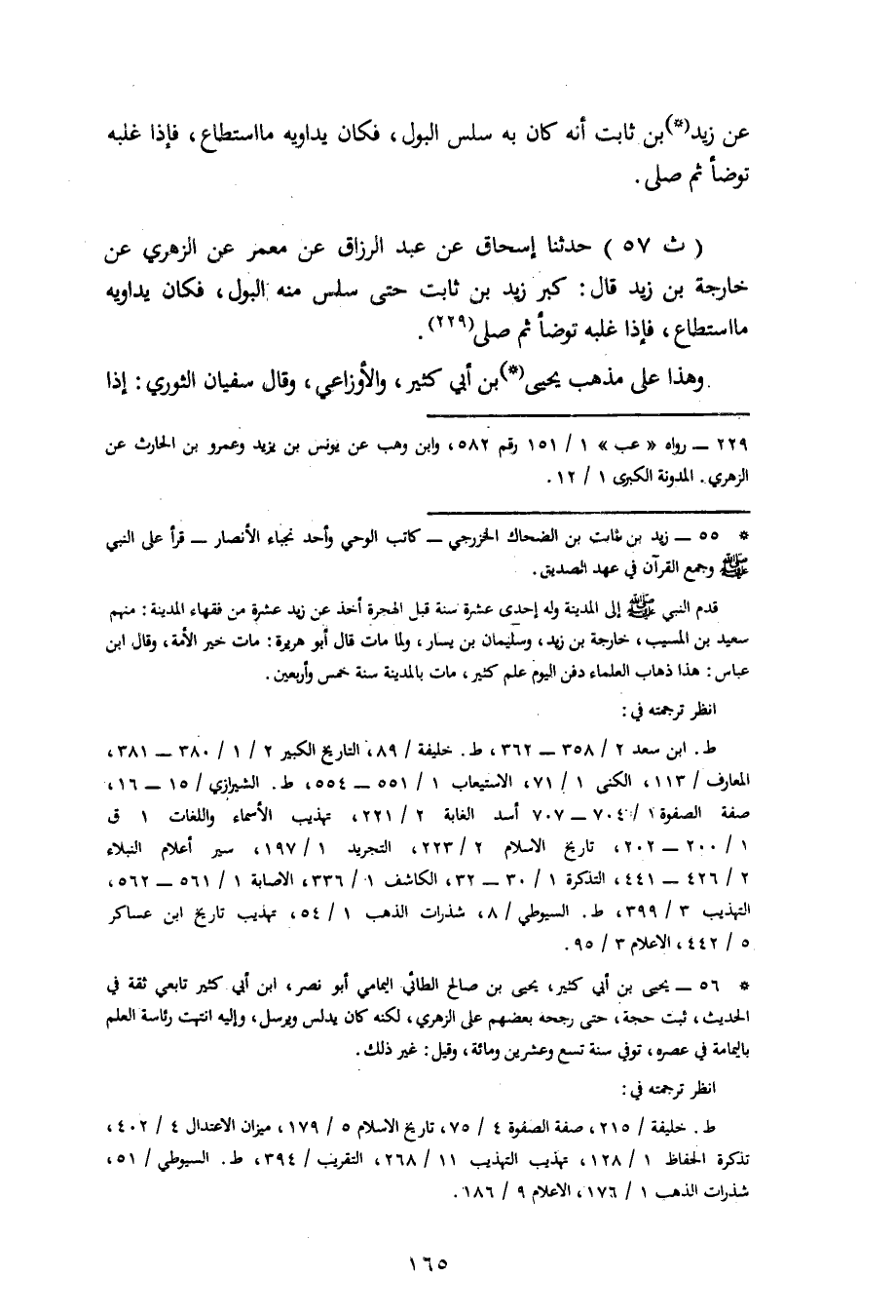 57 - حَدَّثَنَا إِسْحَاقُ، عَنْ عَبْدِ الرَّزَّاقِ، عَنْ مَعْمَرٍ، عَنِ الزُّهْرِيِّ، عَنْ خَارِجَةَ بْنِ زَيْدٍ، قَالَ: كَبِرَ زَيْدُ بْنُ ثَابِتٍ حَتَّى سَلِسَ مِنْهُ الْبَوْلُ فَكَانَ يُدَاوِيهِ مَا اسْتَطَاعَ فَإِذَا غَلَبَهُ تَوَضَّأَ ثُمَّ صَلَّى وَهَذَا عَلَى مَذْهَبِ يَحْيَى بْنِ أَبِي كَثِيرٍ وَالْأَوْزَاعِيِّ، وَقَالَ سُفْيَانُ الثَّوْرِيُّ: إِذَا -[166]- كَانَ بَوْلُهُ لَا يُحْبَسُ فَلْيَضَعْ كِيسًا أَوْ شَيْئًا يَجْعَلُهُ فِيهِ ثُمَّ يَتَوَضَّأُ وَيُصَلِّي. وَقَدْ ثَبَتَ أَنَّ عُمَرَ بْنَ الْخَطَّابِ لَمَّا طُعِنَ صَلَّى وَجُرْحُهُ يَثْعَبُ دَمًا، وَكَانَ الثَّوْرِيُّ يَقُولُ فِي الدَّمِ لَا يَرْقَأُ بِمَنْزِلَةِ الْمُسْتَحَاضَةِ: يَتَوَضَّأُ لِكُلِّ صَلَاةٍ. قَالَ أَبُو بَكْرٍ: وَالَّذِي بِهِ سَلَسُ الْبَوْلِ يَتَوَضَّأُ لِكُلِّ صَلَاةٍ فِي قَوْلِ الشَّافِعِيِّ وَأَبِي ثَوْرٍ. وَقَالَ إِسْحَاقُ وَأَصْحَابُ الرَّأْيِ فِي الْجُرْحِ السَّائِلِ لَا يَنْقَطِعُ: يَتَوَضَّأُ لِكُلِّ صَلَاةٍ وَيُصَلِّي. وَقَدِ احْتَجَّ بِحَدِيثِ عُمَرَ بَعْضُ مَنْ رَأَى أَنْ لَا وُضُوءَ فِي الدَّمِ يَخْرُجُ مِنَ الْجُرْحِ وَالْقَرْحِ سِوَى الْقُبُلِ وَالدَّبْرِ، قَالَ: صَلَّى عُمَرُ وَجُرْحُهُ يَثْعَبُ دَمًا وَلَيْسَ فِي الْحَدِيثِ ذِكْرِ الْوُضُوءِ، فَدُلَّ عَلَى أَنْ لَا وُضُوءَ عَلَى مَنْ سَالَ مِنْ جُرْحِهِ دَمٌ. وَاحْتَجَّ آخَرُ بِحَدِيثِ عُمَرَ وَقَالَ فِي بَعْضِ الْحَدِيثِ: إِنَّ عُمَرَ تَوَضَّأَ، وَقَالَ آخَرُ: لَيْسَ فِي وُضُوءِ عُمَرَ لِهَذَا حُجَّةٌ لِأَنَّ عُمَرَ أُغْمِيَ عَلَيْهِ فَتَوَضَّأَ لِذَلِكَ. وَلَا اخْتِلَافَ بَيْنَ أَهْلِ الْعِلْمِ أَنَّ الْوُضُوءَ يَجِبُ عَلَى مَنْ أُغْمِيَ عَلَيْهِ. وَفِي الَّذِي بِهِ سَلَسُ الْبَوْلِ قَوْلٌ ثَانٍ قَالَهُ مَالِكٌ وَقَدْ ذَكَرْتُهُ قَالَ: أَحَبُّ إِلَيَّ أَنْ يَتَوَضَّأَ لِكُلِّ صَلَاةٍ إِلَّا أَنْ يَكُونَ الْبَرْدُ يُؤْذِيهِ فَإِذَا آذَاهُ رَجَوْتُ أَنْ لَا يَكُونَ عَلَيْهِ ضِيقٌ فِي تَرْكِ الْوُضُوءِ إِنْ شَاءَ اللهُ يَكُفُّ ذَلِكَ عَنْهُ بِخِرْقَةٍ وَيَدْخُلُ الْمَسَاجِدَ. -[167]- قَالَ أَبُو بَكْرٍ: فَكَانَ مَعْنَى قَوْلِ مَالِكٍ أَنَّ حَدَّثَهُ دَائِمٌ وَلَا مَعْنَى لِوُضُوئِهِ لِدَوَامِ ذَلِكَ عَلَيْهِ فِي كُلِّ وَقْتٍ وَهَذَا يُشْبِهُ مَذْهَبَ رَبِيعَةَ فِي الْمُسْتَحَاضَةِ. وَقَدْ حَكَى ابْنُ وَهْبٍ عَنْ مَالِكٍ أَنَّهُ قَالَ فِي الَّذِي سَلِسَ بَوْلُهُ وَهُوَ يَقْطُرُ أَبَدًا لَا يَكَادُ يَنْقَطِعُ قَالَ: إِذَا كَانَ ذَلِكَ يَغْلِبُهُ فَلَيْسَ عَلَيْهِ وُضُوءٌ إِلَّا إِذَا عَمَدَ الْبَوْلَ فَأَحَبُّ إِلَيَّ أَنْ يَتَوَضَّأَ إِذَا عَمَدَ إِلَى الصَّلَاةِ. قَالَ أَبُو بَكْرٍ: لَا فَرْقَ بَيْنَ مَنْ بِهِ سَلَسُ الْبَوْلِ وَبَيْنَ الْمُسْتَحَاضَةِ. وَالْجَوَابُ عِنْدِي فِي هَذَا كَالْجَوَابِ فِي ذَلِكَ
