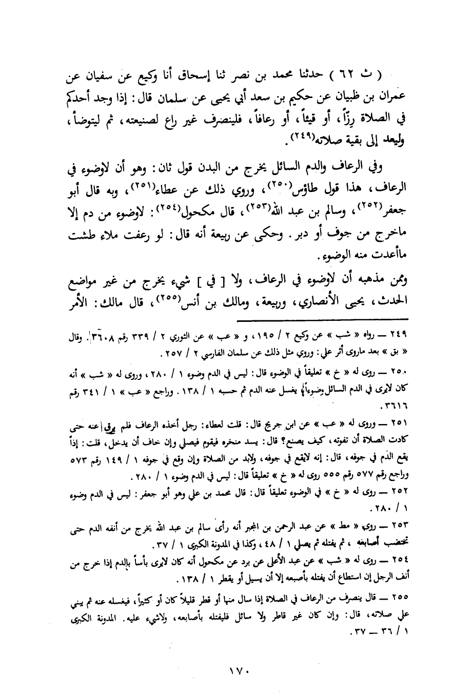 62 - حَدَّثَنَا مُحَمَّدُ بْنُ نَصْرٍ، ثنا إِسْحَاقُ، أنا وَكِيعٌ، عَنْ سُفْيَانَ، عَنْ عِمْرَانَ بْنِ ظَبْيَانَ، عَنْ حَكِيمِ بْنِ سَعْدٍ أَبِي تِحْيَى، عَنْ سَلْمَانَ، قَالَ: إِذَا وَجَدَ أَحَدُكُمْ فِي الصَّلَاةِ رِزًّا أَوْ قَيْئًا أَوْ رُعَافًا فَلْيَنْصَرِفْ غَيْرَ رَاعٍ لِصَنِيعَتِهِ ثُمَّ لِيَتَوَضَّأْ وَلْيَعُدْ إِلَى بَقِيَّةِ صَلَاتِهِ وَفِي الرُّعَافِ وَالدَّمِ السَّائِلِ يَخْرُجُ مِنَ الْبَدَنِ قَوْلٌ ثَانٍ وَهُوَ أَنْ لَا وُضُوءَ فِي الرُّعَافِ هَذَا قَوْلُ طَاوُسٍ، وَرُوِي ذَلِكَ عَنْ عَطَاءٍ وَبِهِ قَالَ أَبُو جَعْفَرٍ وَسَالِمُ بْنُ عَبْدِ اللهِ، قَالَ مَكْحُولٌ: لَا وُضُوءَ مِنْ دَمٍ إِلَّا مَا خَرَجَ مِنْ جَوْفٍ أَوْ دُبُرٍ. وَحُكِيَ عَنْ رَبِيعَةَ أَنَّهُ قَالَ: لَوْ رُعِفْتُ مِلَاءَ طَشْتٍ مَا أَعَدْتُ مِنْهُ الْوُضُوءَ. وَمِمَّنْ مَذْهَبُهُ أَنْ لَا وُضُوءَ فِي الرُّعَافِ وَلَا فِي شَيْءٍ يَخْرُجُ فِي غَيْرِ مَوَاضِعِ الْحَدَثِ يَحْيَى الْأَنْصَارِيُّ وَرَبِيعَةُ وَمَالِكُ بْنُ أَنَسٍ، قَالَ مَالِكٌ: الْأَمْرُ -[171]- عِنْدَنَا أَنَّهُ لَا يَتَوَضَّأُ مِنْ رُعَافٍ وَلَا مِنْ دَمٍ وَلَا مِنْ قَيْحٍ يَسِيلُ مِنَ الْجَسَدِ. وَبِهِ قَالَ الشَّافِعِيُّ وَأَبُو ثَوْرٍ. وَأَسْقَطَتْ فِرْقَةٌ ثَالِثَةٌ عَنِ الْقَلِيلِ مِنْهُ الْوُضُوءَ. رُوِّينَا عَنْ عَبْدِ اللهِ بْنِ أَبِي أَوْفَى: أَنَّهُ بَزَقَ دَمًا ثُمَّ قَامَ فَصَلَّى، وَعَنِ ابْنِ عَبَّاسٍ أَنَّهُ قَالَ: إِذَا كَانَ الدَّمُ فَاحِشًا فَعَلَيْهِ الْوُضُوءُ وَإِنْ كَانَ قَلِيلًا فَلَا إِعَادَةَ عَلَيْهِ. قَالَ أَبُو بَكْرٍ: وَهَذَا يَحْتَمِلُ مَعْنَيَيْنِ يَحْتَمِلُ أَنْ يَكُونَ أَرَادَ إِذَا صَلَّى وَفِي ثَوْبِهِ دَمٌ فَلَا إِعَادَةَ عَلَيْهِ وَيَحْتَمِلُ غَيْرَ ذَلِكَ وَعَنِ ابْنِ عُمَرَ أَنَّهُ عَصَرَ بَثْرَةً كَانَتْ بِجَبْهَتِهِ فَخَرَجَ مِنْهَا دَمٌ وَقَيْحٌ فَمَسَحَهَا وَصَلَّى وَلَمْ يَتَوَضَّأْ. وَرُوِّينَا عَنْ أَبِي هُرَيْرَةَ: أَنَّهُ أَدْخَلَ إِصْبَعَهُ فِي أَنْفِهِ فَخَرَجَ فِيهَا دَمٌ فَفَتَّهُ بِأُصْبُعِهِ ثُمَّ صَلَّى وَلَمْ يَتَوَضَّأْ. وَعَنْ جَابِرٍ أَنَّهُ قَالَ: لَوْ أَدْخَلْتُ أُصْبُعِي -[172]- فِي أَنْفِي ثُمَّ خَرَجَ دَمٌ لَدَلَكْتُهُ بِالْبَطْحَاءِ وَمَا تَوَضَّأْتُ. وَعَنْ أَبِي هُرَيْرَةَ: أَنَّهُ كَانَ لَا يَرَى أَنْ يُعِيدَ الْوُضُوءَ مِنَ الْقَطْرَةِ وَالْقَطْرَتَيْنِ. وَعَنِ ابْنِ مَسْعُودٍ: أَنَّهُ أَدْخَلَ أَصَابِعَهُ فِي أَنْفِهِ فَخَضَّبَهُنَّ فِي الدِّمَاءِ ثُمَّ قَالَ بِهِنَّ فِي التُّرَابِ فَفَتَّهُنَّ ثُمَّ قَامَ إِلَى الصَّلَاةِ