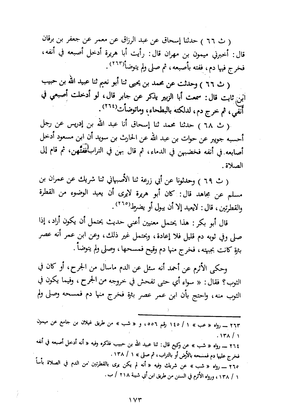 66 - حَدَّثَنَا إِسْحَاقُ، عَنْ عَبْدِ الرَّزَّاقِ، عَنْ مَعْمَرٍ، عَنْ جَعْفَرِ بْنِ بُرْقَانَ، قَالَ: أَخْبَرَنِي مَيْمُونُ بْنُ مِهْرَانَ، قَالَ: رَأَيْتُ أَبَا هُرَيْرَةَ أَدْخَلَ أُصْبُعَهُ فِي أَنْفِهِ فَخَرَجَ فِيهَا دَمٌ فَفَتَّهُ بِأُصْبُعِهِ ثُمَّ صَلَّى وَلَمْ يَتَوَضَّأْ