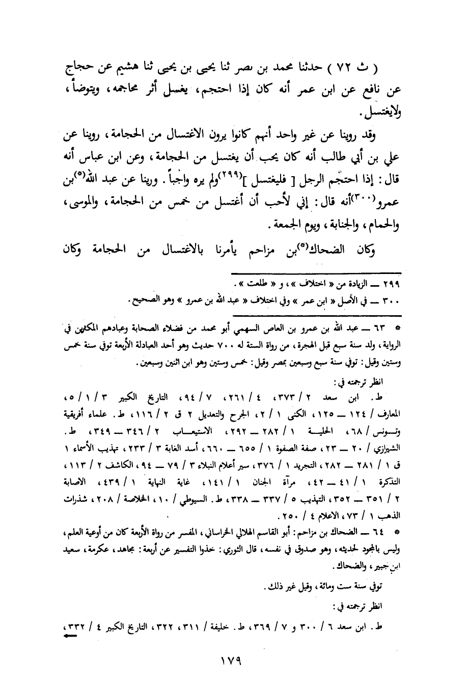 72 - حَدَّثَنَا مُحَمَّدُ بْنُ نَصْرٍ، ثنا يَحْيَى بْنُ يَحْيَى، ثنا هُشَيْمٌ، عَنْ حَجَّاجٍ، عَنْ نَافِعٍ، عَنِ ابْنِ عُمَرَ، أَنَّهُ كَانَ إِذَا احْتَجَمَ يَغْسِلُ أَثَرَ مَحَاجِمِهِ وَيَتَوَضَّأُ وَلَا يَغْتَسِلُ وَقَدْ رُوِّينَا عَنْ غَيْرِ وَاحِدٍ أَنَّهُمُ كَانُوا يَرَوْنَ الِاغْتِسَالَ مِنَ الْحِجَامَةِ، رُوِّينَا عَنْ عَلِيِّ بْنِ أَبِي طَالِبٍ أَنَّهُ كَانَ يُحِبُّ أَنْ يَغْتَسِلَ مِنَ الْحِجَامَةِ وَعَنِ ابْنِ عَبَّاسٍ أَنَّهُ قَالَ: إِذَا احْتَجَمَ الرَّجُلُ فَلْيَغْتَسِلْ، وَلَمْ يَرَهُ وَاجِبًا. وَرُوِّينَا عَنْ عَبْدِ اللهِ بْنِ عَمْرٍو أَنَّهُ قَالَ: إِنِّي لَأُحِبُّ أَنْ أَغْتَسِلَ مِنْ خَمْسٍ: مِنَ الْحِجَامَةِ وَالْمُوسَى وَالْحَمَّامِ وَالْجَنَابَةِ وَيَوْمِ الْجُمُعَةِ. وَكَانَ الضَّحَّاكُ بْنُ مُزَاحِمٍ يَأْمُرُنَا بِالِاغْتِسَالِ مِنَ الْحِجَامَةِ. وَكَانَ -[180]- مُجَاهِدٌ يَغْتَسِلُ مِنْهَا