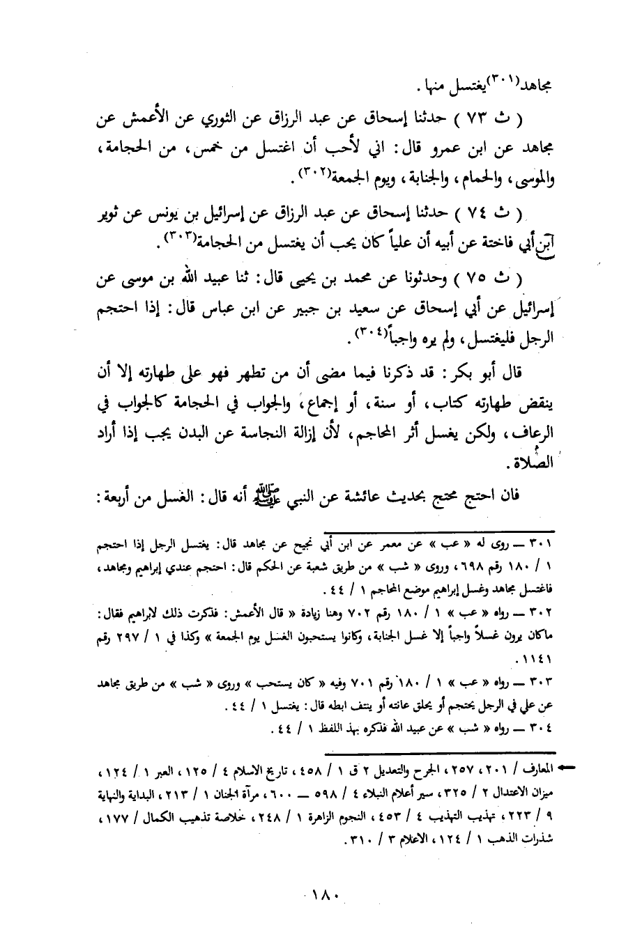 73 - حَدَّثَنَا إِسْحَاقُ، عَنْ عَبْدِ الرَّزَّاقِ، عَنِ الثَّوْرِيِّ، عَنِ الْأَعْمَشِ، عَنْ مُجَاهِدٍ، عَنِ ابْنِ عَمْرٍو، قَالَ: إِنِّي لَأُحِبُّ أَنْ أَغْتَسِلَ مِنْ خَمْسٍ: مِنَ الْحِجَامَةِ وَالْمُوسَى وَالْحَمَّامِ وَالْجَنَابَةِ وَيَوْمِ الْجُمُعَةِ