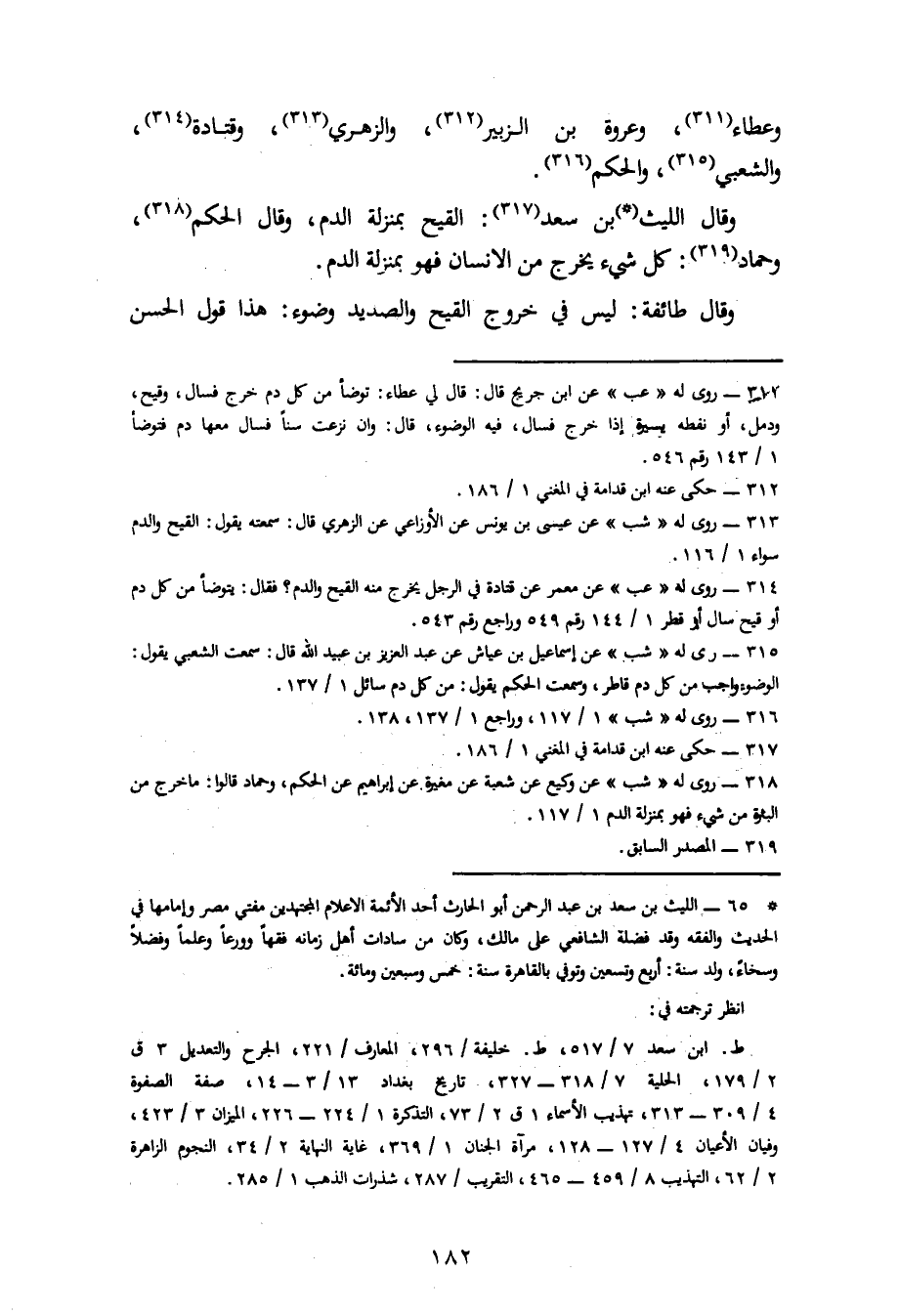 وَعَطَاءٌ وَعُرْوَةُ بْنُ الزُّبَيْرِ وَالزُّهْرِيُّ وَقَتَادَةُ وَالشَّعْبِيُّ وَالْحَكَمُ، وَقَالَ اللَّيْثُ بْنُ سَعْدٍ: الْقَيْحُ بِمَنْزِلَةِ الدَّمِ، وَقَالَ الْحَكَمُ وَحَمَّادٌ: كُلُّ شَيْءٍ يَخْرُجُ مِنَ الْإِنْسَانِ فَهُوَ بِمَنْزِلَةِ الدَّمِ. وَقَالَتْ طَائِفَةٌ لَيْسَ فِي خُرُوجِ الْقَيْحِ وَالصَّدِيدِ وُضُوءٌ، هَذَا قَوْلُ الْحَسَنِ