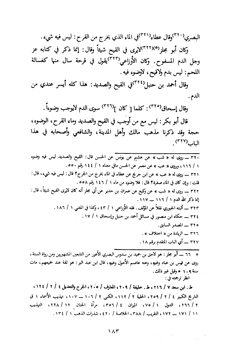 الْبَصْرِيِّ، وَقَالَ عَطَاءٌ فِي الْمَاءِ الَّذِي يَخْرُجُ مِنَ الْقَرْحِ: لَيْسَ فِيهِ شَيْءٌ، وَكَانَ أَبُو مِجْلَزٍ لَا يَرَى فِي الْقَيْحِ شَيْئًا وَقَالَ: إِنَّمَا ذَكَرَ فِي كِتَابِهِ عَزَّ وَجَلَّ الدَّمَ الْمَسْفُوحَ، وَكَانَ الْأَوْزَاعِيُّ يَقُولُ فِي قُرْحَةٍ سَالَ مِنْهَا كَغُسَالَةِ اللَّحْمِ لَيْسَ بِدَمٍ وَلَا قَيْحٍ لَا وُضُوءَ فِيهِ، وَقَالَ أَحْمَدُ بْنُ حَنْبَلٍ فِي الْقَيْحِ وَالصَّدِيدِ هَذَا كُلُّهُ أَيْسَرُ عِنْدِي مِنَ الدَّمِ، وَقَالَ إِسْحَاقُ: كُلُّ مَا كَانَ سِوَى الدَّمِ لَا يُوجِبُ وُضُوءًا. قَالَ أَبُو بَكْرٍ: لَيْسَ مَعَ مَنْ أَوْجَبَ فِي الْقَيْحِ وَالصَّدِيدِ وَمَاءِ الْقَرْحِ الْوُضُوءَ حُجَّةٌ، وَقَدْ ذَكَرْنَا مَذْهَبَ مَالِكٍ وَأَهْلِ الْمَدِينَةِ وَالشَّافِعِيِّ وَأَصْحَابِهِ فِي هَذَا الْبَابِ -[184]- وَقَالَ أَصْحَابُ الرَّأْيِ فِي النَّفْطَةِ يَسِيلُ مِنْهَا مَاءٌ أَوْ دَمٌ أَوْ قَيْحٌ أَوْ صَدِيدٌ: إِنْ سَالَ عَنْ رَأْسِ الْجُرْحِ نَقَضَ الْوُضُوءَ وَإِنْ لَمْ يَسِلْ لَمْ يَنْقُضْ.