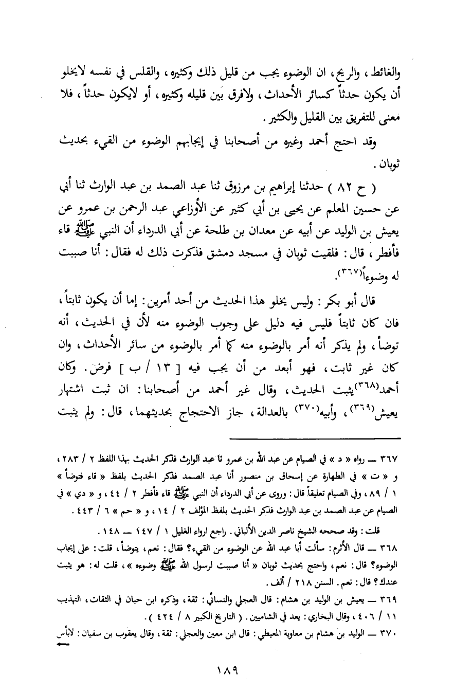 82 - حَدَّثَنَا إِبْرَاهِيمُ بْنُ مَرْزُوقٍ، ثنا عَبْدُ الصَّمَدِ بْنُ عَبْدِ الْوَارِثِ، ثنا أَبِي، عَنْ حُسَيْنٍ الْمُعَلِّمِ، عَنْ يَحْيَى بْنِ أَبِي كَثِيرٍ، عَنِ الْأَوْزَاعِيِّ عَبْدِ الرَّحْمَنِ بْنِ عَمْرٍو، عَنْ يَعِيشَ بْنِ الْوَلِيدِ، عَنْ أَبِيهِ، عَنْ مَعْدَانَ بْنِ طَلْحَةَ، عَنْ أَبِي الدَّرْدَاءِ، أَنَّ النَّبِيَّ صَلَّى اللَّهُ عَلَيْهِ وَسَلَّمَ قَاءَ فَأَفْطَرَ قَالَ: فَلَقِيتُ ثَوْبَانَ فِي مَسْجِدِ دِمَشْقَ فَذَكَرْتُ ذَلِكَ لَهُ فَقَالَ: أَنَا صَبَبْتُ لَهُ وُضُوءًا قَالَ أَبُو بَكْرٍ: وَلَيْسَ يَخْلُوا هَذَا الْحَدِيثُ مِنْ أَحَدِ أَمْرَيْنِ: إِمَّا أَنْ يَكُونَ ثَابِتًا فَإِنْ كَانَ ثَابِتًا فَلَيْسَ فِيهِ دَلِيلٌ عَلَى وُجُوبِ الْوُضُوءِ مِنْهُ لِأَنَّ فِي الْحَدِيثِ أَنَّهُ تَوَضَّأَ وَلَمْ يَذْكُرْ أَنَّهُ أَمَرَ بِالْوُضُوءِ مِنْهُ كَمَا أَمَرَ بِالْوُضُوءِ مِنْ سَائِرِ الْأَحْدَاثِ، وَإِنْ كَانَ غَيْرَ ثَابِتٌ فَهُوَ أَبْعَدُ مِنْ أَنْ يَجِبَ فِيهِ فَرْضٌ. وَكَانَ أَحْمَدُ يُثْبِتُ الْحَدِيثَ , وَقَالَ غَيْرُ أَحْمَدَ مِنْ أَصْحَابِنَا إِنْ ثَبَتَ اشْتِهَارُ يَعِيشَ وَأَبِيهِ بِالْعَدَالَةِ جَازَ الِاحْتِجَاجُ بِحَدِيثِهَمَا، قَالَ: وَلَمْ يَثْبُتْ -[190]- ذَلِكَ عِنْدَنَا بَعْدُ، وَاسْتَحَبَّ هَذَا الْقَائِلُ الْوُضُوءَ فِيهِ. قَالَ أَبُو بَكْرٍ: فَإِنْ ثَبَتَ الْحَدِيثُ لَمْ يُوجِبْ فَرْضًا لِأَنَّ النَّبِيَّ صَلَّى اللَّهُ عَلَيْهِ وَسَلَّمَ لَمْ يَأْمُرْ بِهِ فِيمَا نَعْلَمُ وَاللهُ أَعْلَمُ