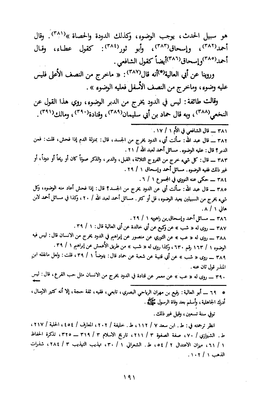 هُوَ سَبِيلُ الْحَدَثِ يُوجِبُ الْوُضُوءَ، وَكَذَلِكَ الدُّودَةُ وَالْحَصَاةُ. وَقَالَ أَحْمَدُ وَإِسْحَاقُ وَأَبُو ثَوْرٍ كَقَوْلِ عَطَاءٍ، وَقَالَ أَحْمَدُ وَإِسْحَاقُ أَيْضًا كَقَوْلِ الشَّافِعِيِّ. وَرُوِّينَا عَنْ أَبِي الْعَالِيَةِ أَنَّهُ قَالَ: مَا خَرَجَ مِنَ النِّصْفِ الْأَعْلَى فَلَيْسَ عَلَيْهِ وُضُوءٌ وَمَا خَرَجَ مِنَ النِّصْفِ الْأَسْفَلِ فَعَلَيْهِ الْوُضُوءُ. وَقَالَتْ طَائِفَةٌ: لَيْسَ فِي الدُّودِ يَخْرُجُ مِنَ الدُّبُرِ الْوُضُوءُ، رُوِيَ هَذَا الْقَوْلُ عَنِ النَّخَعِيِّ وَبِهِ قَالَ حَمَّادُ بْنُ أَبِي سُلَيْمَانَ وَقَتَادَةُ وَمَالِكٌ،