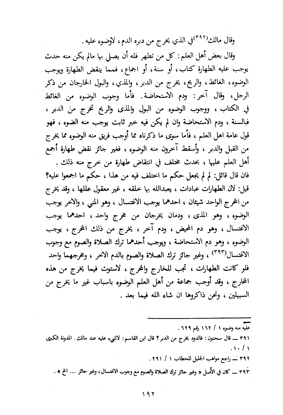 وَقَالَ مَالِكٌ فِي الَّذِي يَخْرُجُ مِنْ دُبُرِهِ الدَّمُ لَا وُضُوءَ عَلَيْهِ، وَقَالَ بَعْضُ أَهْلِ الْعِلْمِ: كُلُّ مَنْ تَطَهَّرَ فَلَهُ أَنْ يُصَلِّيَ بِهَا مَا لَمْ يَكُنْ مِنْهُ حَدَثٌ يُوجِبُ عَلَيْهِ الطَّهَارَةَ كِتَابٌ أَوْ سُنَّةٌ أَوْ إِجْمَاعٌ، فَمِمَّا يَنْقُضُ الطَّهَارَةَ وَيُوجِبُ الْوُضُوءَ الْغَائِطُ وَالرِّيحُ يَخْرُجُ مِنَ الدُّبُرِ وَالْمَذْيُ وَالْبَوْلُ الْخَارِجَانِ مِنْ ذَكَرِ الرَّجُلِ وَقَالَ آخَرُ: وَدَمُ الِاسْتِحَاضَةِ فَأَمَّا وُجُوبُ الْوُضُوءِ مِنَ الْغَائِطِ فِي الْكِتَابِ وَوُجُوبُ الْوُضُوءِ مِنَ الْبَوْلِ وَالْمَذْيِ وَالرِّيحِ تَخْرُجُ مِنَ الدُّبُرِ فَبِالسُّنَّةِ، وَدَمُ الِاسْتِحَاضَةِ وَإِنْ لَمْ يَكُنْ فِيهِ خَبَرٌ ثَابِتٌ يُوجِبُ مِنْهُ الْوُضُوءَ فَهُوَ قَوْلُ عَامَّةِ أَهْلِ الْعِلْمِ، فَأَمَّا سِوَى مَا ذَكَرْنَاهُ مِمَّا أَوْجَبَ فَرِيقٌ مِنْهُ الْوُضُوءَ مِمَّا يَخْرُجُ مِنَ الْقُبَلِ وَالدَّبْرِ وَأَسْقَطَ آخَرُونَ مِنْهُ الْوُضُؤَءَ فَغَيْرُ جَائِزٍ نَقْضُ طَهَارَةٍ أَجْمَعَ أَهْلُ الْعِلْمِ عَلَيْهَا بِحَدَثٍ مُخْتَلِفٍ فِي انْتِقَاضِ طَهَارَةِ مَنْ خَرَجَ مِنْهُ ذَلِكَ فَإِنْ قَالَ قَائِلٌ لِمَ لَمْ يُجْعَلْ حُكْمُ مَا اخْتُلِفَ فِيهِ مَنْ هَذَا حُكْمَ مَا أَجْمَعُوا عَلَيْهِ؟ قِيلَ: لِأَنَّ الطَّهَارَاتِ عِبَادَاتٌ يُعْبَدُ اللهُ بِهَا خَلْقَهُ غَيْرُ مَعْقُولٍ عِلَلُهَا وَقَدْ يَخْرُجُ مِنَ الْمَخْرَجِ الْوَاحِدِ شَيْئَانِ أَحَدُهُمَا يُوجِبُ الِاغْتِسَالَ وَهُوَ الْمَنِيُّ، وَالْآخَرُ يُوجِبُ الْوُضُوءَ وَهُوَ الْمَذْيُ، وَدَمَانِ يَخْرُجَانِ مِنْ مَخْرَجٍ وَاحِدٍ أَحَدُهُمَا يُوجِبُ الِاغْتِسَالَ وَهُوَ دَمُ الْمَحِيضِ وَدَمٌ آخَرُ يَخْرُجُ مِنْ ذَلِكَ الْمَخْرَجِ يُوجِبُ الْوُضُوءَ وَهُوَ دَمُ الِاسْتِحَاضَةِ، وَيُوجِبُ أَحَدُهُمَا تَرْكَ الصَّلَاةِ وَالصَّوْمِ مَعَ وُجُوبِ الِاغْتِسَالِ وَغَيْرُ جَائِزٍ تَرْكُ الصَّلَاةِ وَالصَّوْمِ بِالدَّمِ الْآخَرِ وَمَخْرَجُهُمَا وَاحِدٌ، فَلَوْ كَانَتِ الطَّهَارَاتُ تَجِبُ لِلْخَارِجِ وَالْمَخْرَجِ لَاسْتَوَتْ فِيمَا يَخْرُجُ مِنْ هَذِهِ الْمَخَارِجِ وَقَدْ أَوْجَبَ جَمَاعَةٌ مِنْ أَهْلِ الْعِلْمِ الْوُضُوءَ بِأَسْبَابٍ غَيْرِ مَا يَخْرُجُ مِنَ السَّبِيلَيْنِ وَنَحْنُ ذَاكِرُوهَا إِنْ شَاءَ اللهُ فِيمَا بَعْدُ.