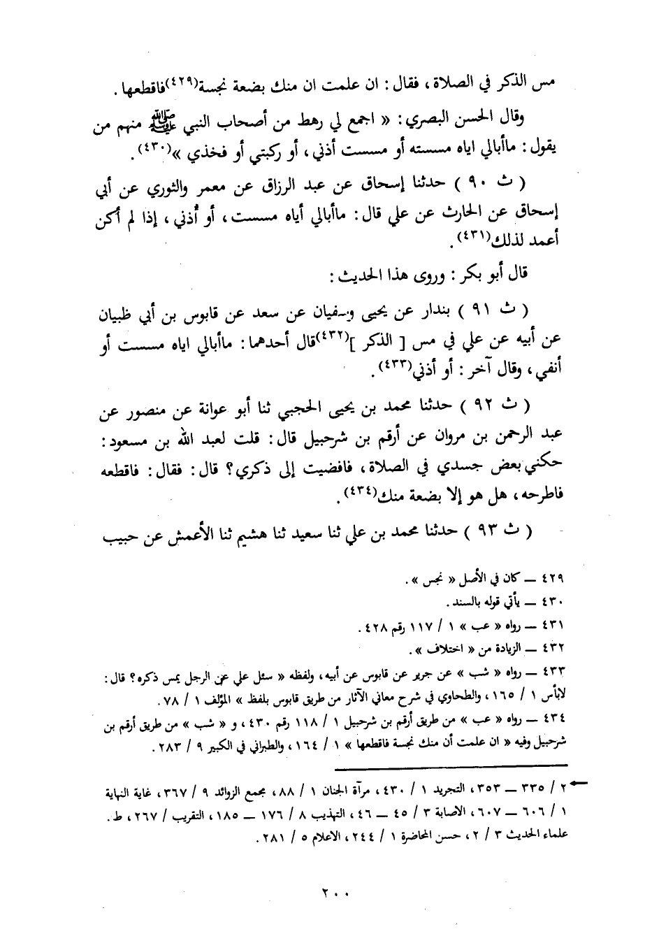 93 - حَدَّثَنَا مُحَمَّدُ بْنُ عَلِيٍّ، ثنا سَعِيدٌ، ثنا هُشَيْمٌ، ثنا الْأَعْمَشُ، عَنْ حَبِيبِ -[201]- بْنِ أَبِي ثَابِتٍ، عَنْ سَعِيدِ بْنِ جُبَيْرٍ، عَنِ ابْنِ عَبَّاسٍ، أَنَّهُ كَانَ لَا يَرَى فِي مَسِّ الذَّكَرِ وُضُوءًا