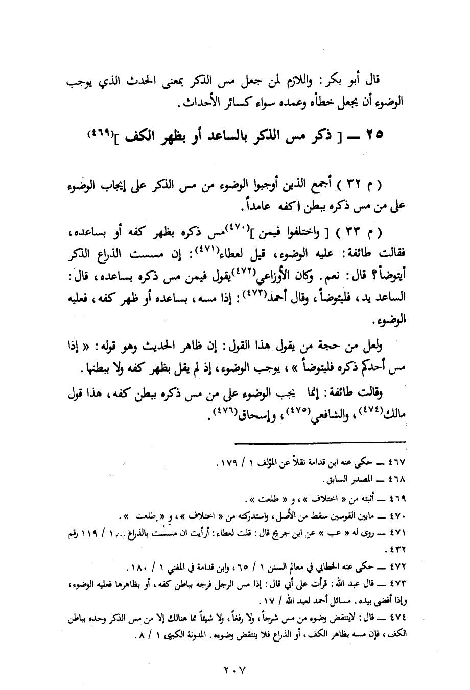 ذِكْرُ مَسِّ الذَّكَرِ بِالسَّاعِدِ أَوْ بِظَهْرِ الْكَفِّ أَجْمَعَ الَّذِينَ أَوْجَبُوا الْوُضُوءَ مِنْ مَسِّ الذَّكَرِ عَلَى إِيجَابِ الْوُضُوءِ عَلَى مَنْ مَسَّ ذَكَرَهُ بِبَطْنِ كَفِّهِ عَامِدًا. وَاخْتَلَفُوا فِيمَنْ مَسَّ ذَكَرَهُ بِظَهْرِ كَفِّهِ أَوْ بِسَاعِدِهِ فَقَالَتْ طَائِفَةٌ: عَلَيْهِ الْوُضُوءُ. قِيلَ لِعَطَاءٍ: إِنْ مَسَّتِ الذِّرَاعُ الذَّكَرَ أَيَتَوَضَّأُ؟ قَالَ: نَعَمْ. وَكَانَ الْأَوْزَاعِيُّ يَقُولُ فِيمَنْ مَسَّ ذَكَرَهُ بِسَاعِدِهِ قَالَ: السَّاعِدُ يَدٌ فَلْيَتَوَضَّأْ. وَقَالَ أَحْمَدُ: إِذَا مَسَّهُ بِسَاعِدِهِ أَوْ ظَهْرِ كَفِّهِ فَعَلَيْهِ الْوُضُوءُ. وَلَعَلَّ مِنْ حُجَّةِ مَنْ يَقُولُ هَذَا الْقَوْلَ أَنَّ ظَاهِرَ الْحَدِيثِ وَهُوَ قَوْلُهُ: «إِذَا مَسَّ أَحَدُكُمْ ذَكَرَهُ فَلْيَتَوَضَّأْ» . يُوجِبُ الْوُضُوءَ إِذْ لَمْ يَقُلْ بِظَهْرِ كَفِّهِ وَلَا بِبَطْنِهَا. وَقَالَتْ طَائِفَةٌ: إِنَّمَا يَجِبُ الْوُضُوءُ عَلَى مَنْ مَسَّ ذَكَرَهُ بِبَطْنِ كَفِّهِ هَذَا قَوْلُ مَالِكٍ وَالشَّافِعِيِّ وَإِسْحَاقَ،