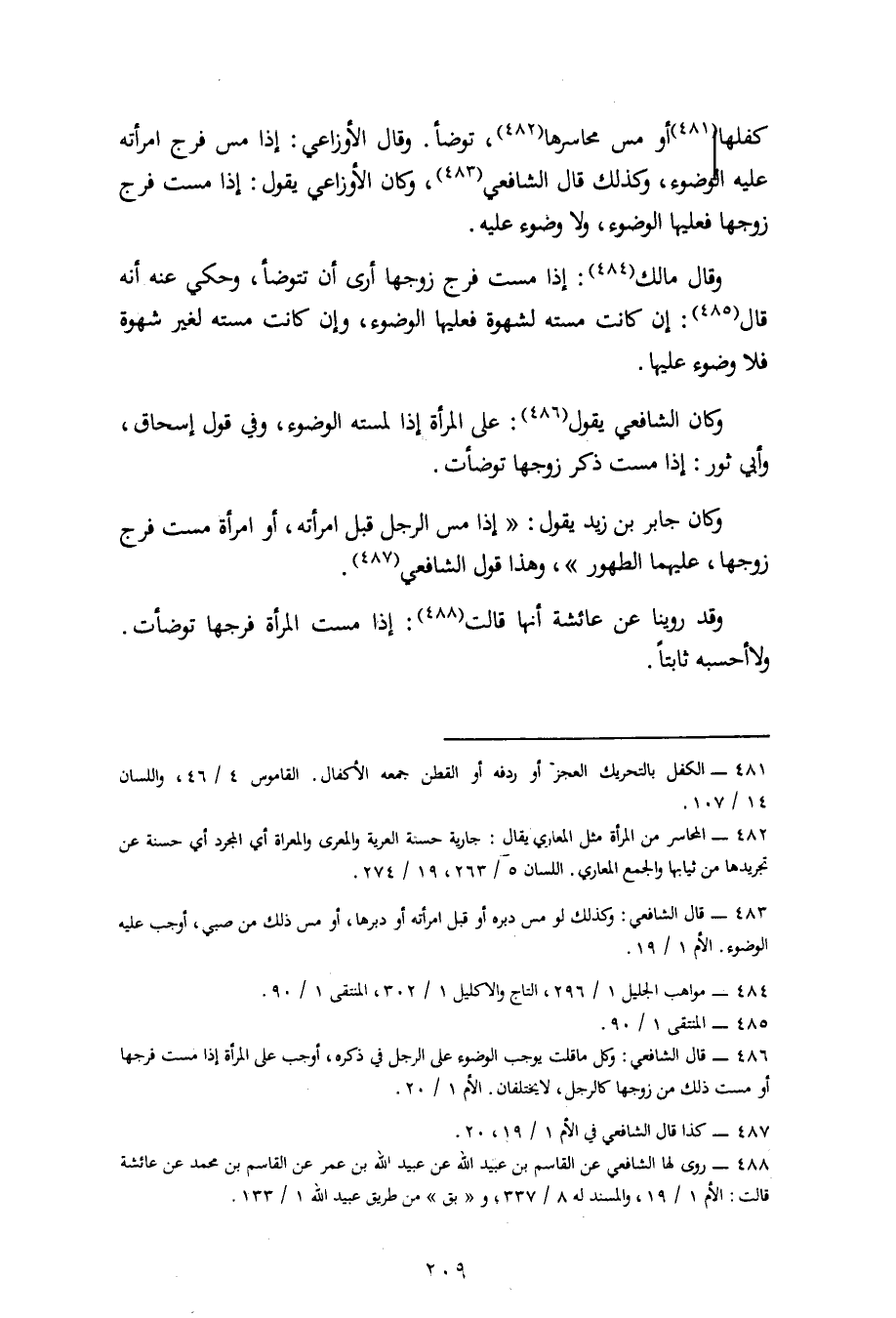 كَفَلِهَا أَوْ مَسَّ مَحَاسِرَهَا تَوَضَّأَ. وَقَالَ الْأَوْزَاعِيُّ: إِذَا مَسَّ فَرْجَ امْرَأَتِهِ عَلَيْهِ الْوُضُوءُ. وَكَذَلِكَ قَالَ الشَّافِعِيُّ. وَكَانَ الْأَوْزَاعِيُّ يَقُولُ: إِذَا مَسَّتْ فَرْجَ زَوْجِهَا فَعَلَيْهَا الْوُضُوءُ وَلَا وُضُوءَ عَلَيْهِ. وَقَالَ مَالِكٌ: إِذَا مَسَّتْ فَرْجَ زَوْجِهَا أَرَى أَنْ تَتَوَضَّأَ. وَحُكِيَ عَنْهُ أَنَّهُ قَالَ: إِنْ كَانَتْ مَسَّتْهُ لِشَهْوَةٍ فَعَلَيْهَا الْوُضُوءُ، وَإِنْ كَانَتْ مَسَّتْهُ لِغَيْرِ شَهْوَةٍ فَلَا وُضُوءَ عَلَيْهَا. وَكَانَ الشَّافِعِيُّ يَقُولُ: عَلَى الْمَرْأَةِ إِذَا لَمَسَتْهُ الْوُضُوءُ. وَفِي قَوْلِ إِسْحَاقَ وَأَبِي ثَوْرٍ إِذَا مَسَّتْ ذَكَرَ زَوْجِهَا تَوَضَّأَتْ. وَكَانَ جَابِرُ بْنُ زَيدِ يَقُولُ: إِذَا مَسَّ الرَّجُلُ قُبُلَ امْرَأَتِهِ أَوِ امْرَأَةٌ مَسَّتْ فَرْجَ زَوْجِهَا عَلَيْهِمَا الطُّهُورُ. وَهَذَا قَوْلُ الشَّافِعِيِّ. وَقَدْ رُوِّينَا عَنْ عَائِشَةَ أَنَّهَا قَالَتْ: إِذَا مَسَّتِ الْمَرْأَةُ فَرْجَهَا تَوَضَّأَتْ. وَلَا أَحْسَبُهُ ثَابِتًا