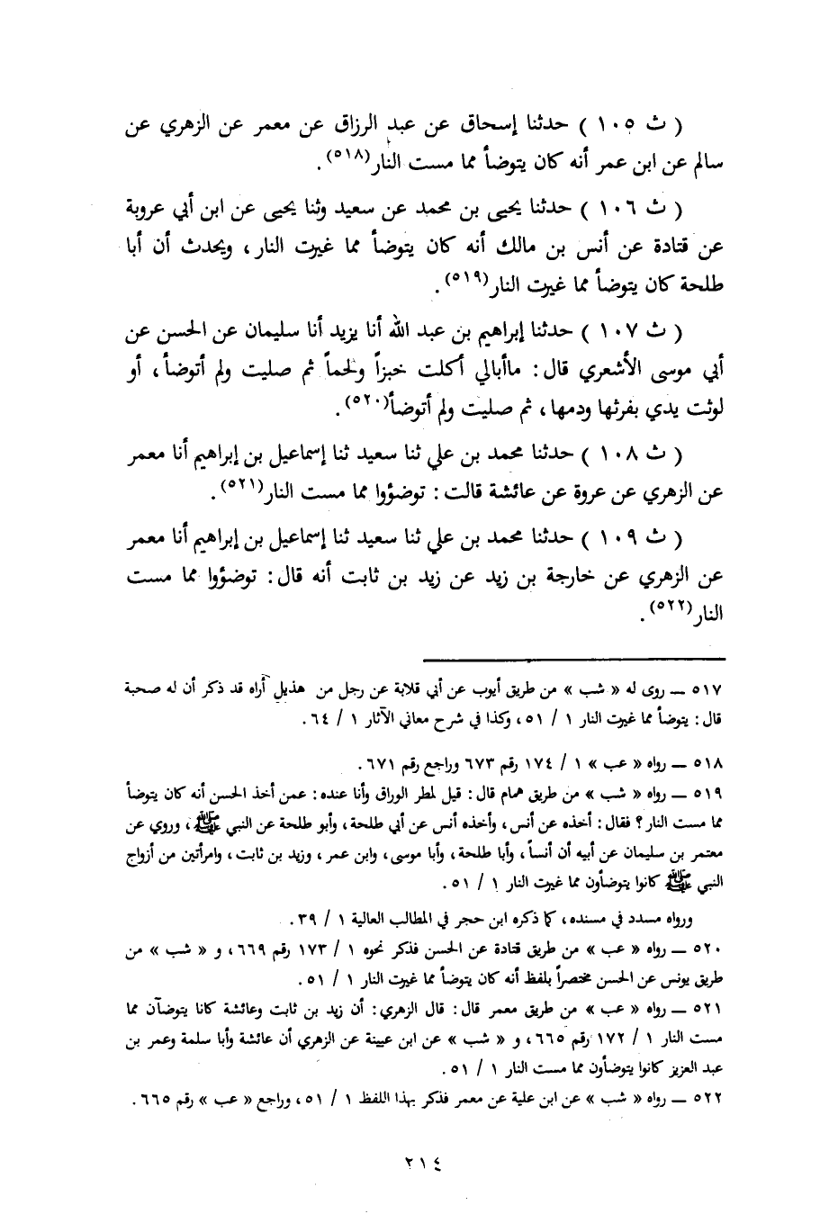109 - حَدَّثَنَا مُحَمَّدُ بْنُ عَلِيٍّ، ثنا سَعِيدٌ، ثنا إِسْمَاعِيلُ بْنُ إِبْرَاهِيمَ، أنا مَعْمَرٌ، عَنِ الزُّهْرِيِّ، عَنْ خَارِجَةَ بْنِ زَيْدٍ، عَنْ زَيْدِ بْنِ ثَابِتٍ، أَنَّهُ قَالَ: تَوَضَّئُوا مِمَّا مَسَّتِ النَّارُ