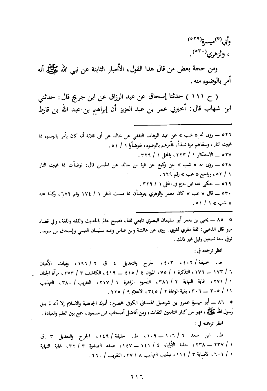 111 - حَدَّثَنَا إِسْحَاقُ، عَنْ عَبْدِ الرَّزَّاقِ، عَنِ ابْنِ جُرَيْجٍ، قَالَ: حَدَّثَنِي ابْنُ شِهَابٍ، قَالَ: أَخْبَرَنِي عُمَرُ بْنُ عَبْدِ الْعَزِيزِ، أَنَّ إِبْرَاهِيمَ بْنَ عَبْدِ اللهِ بْنِ قَارِظٍ -[217]- أَخْبَرَهُ أَنَّهُ وَجَدَ أَبَا هُرَيْرَةَ يَتَوَضَّأُ عَلَى ظَهْرِ الْمَسْجِدِ فَقَالَ أَبُو هُرَيْرَةَ: إِنَّمَا أَتَوَضَّأُ مِنْ أَثْوَارِ أَقِطٍ أَكَلْتُهَا، لِأَنَّ رَسُولَ اللهِ صَلَّى اللَّهُ عَلَيْهِ وَسَلَّمَ قَالَ: «تَوَضَّئُوا مِمَّا مَسَّتِ النَّارُ» حَدَّثَنِي عَلِيٌّ، عَنْ أَبِي عُبَيْدٍ، قَوْلُهُ ثَوْرٌ الْقِطْعَةُ مِنَ الْأَقِطِ وَجَمْعُهَا أَثْوَارٌ. وَمِمَّنْ رَوَى عَنِ النَّبِيِّ صَلَّى اللَّهُ عَلَيْهِ وَسَلَّمَ أَنَّهُ أَمَرَهُ بِالْوُضُوءِ مِمَّا مَسَّتِ النَّارُ زَيْدُ بْنُ ثَابِتٍ وَأَبُو طَلْحَةَ وَأَبُو أَيُّوبَ الْأَنْصَارِيُّ وَأَبُو مُوسَى -[218]- الْأَشْعَرِيُّ وَسَهْلُ بْنُ الْحَنْظَلِيَّةِ وَسَلَمَةُ بْنُ وَقْشٍ وَأُمُّ سَلَمَةَ وَابْنُ عُمَرَ وَعَائِشَةُ وَأُمُّ حَبِيبَةَ. وَقَدْ ذَكَرْتُ -[219]- أَسَانِيدَهَا فِي كِتَابِ السُّنَنِ. وَأَسْقَطَتْ طَائِفَةٌ الْوُضُوءَ مِمَّا مَسَّتِ النَّارُ فَمِمَّنْ كَانَ لَا يَرَى الْوُضُوءَ مِمَّا مَسَّتِ النَّارُ أَبُو بَكْرٍ الصِّدِّيقُ وَعُمَرُ بْنُ الْخَطَّابِ وَعُثْمَانُ بْنُ عَفَّانَ وَعَلِيُّ -[220]- بْنُ أَبِي طَالِبٍ وَعَبْدُ اللهِ بْنُ مَسْعُودٍ وَأَبُو الدَّرْدَاءِ وَابْنُ عَبَّاسٍ وَعَامِرُ بْنُ رَبِيعَةَ وَأَبُو أُمَامَةَ الْبَاهِلِيُّ وَأُبَيُّ بْنُ كَعْبٍ