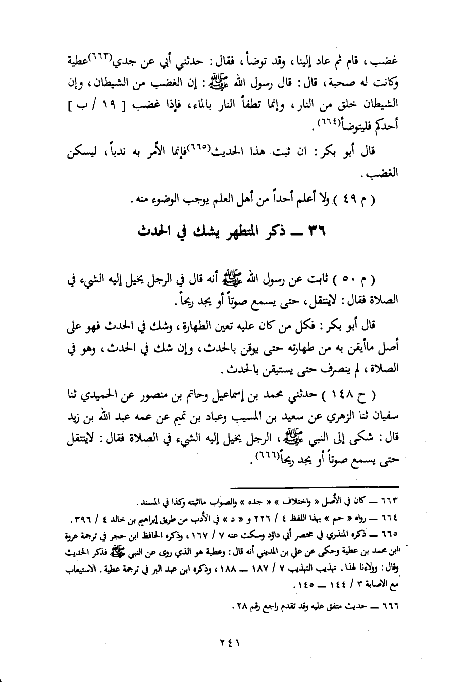 148 - حَدَّثَنِي مُحَمَّدُ بْنُ إِسْمَاعِيلَ، وَحَاتِمُ بْنُ مَيْمُونٍ، عَنِ الْحُمَيْدِيِّ، ثنا سُفْيَانُ، ثنا الزُّهْرِيُّ، عَنْ سَعِيدِ بْنِ الْمُسَيِّبِ، وَعَبَّادُ بْنُ تَمِيمٍ، عَنْ عَمِّهِ عَبْدِ اللهِ بْنِ زَيْدٍ، قَالَ: شُكِيَ إِلَى النَّبِيِّ صَلَّى اللَّهُ عَلَيْهِ وَسَلَّمَ الرَّجُلُ يُخَيَّلُ إِلَيْهِ الشَّيْءُ فِي الصَّلَاةِ، فَقَالَ: «لَا يَنْتَقِلُ حَتَّى يَسْمَعَ صَوْتًا أَوْ يَجِدَ رِيحًا»