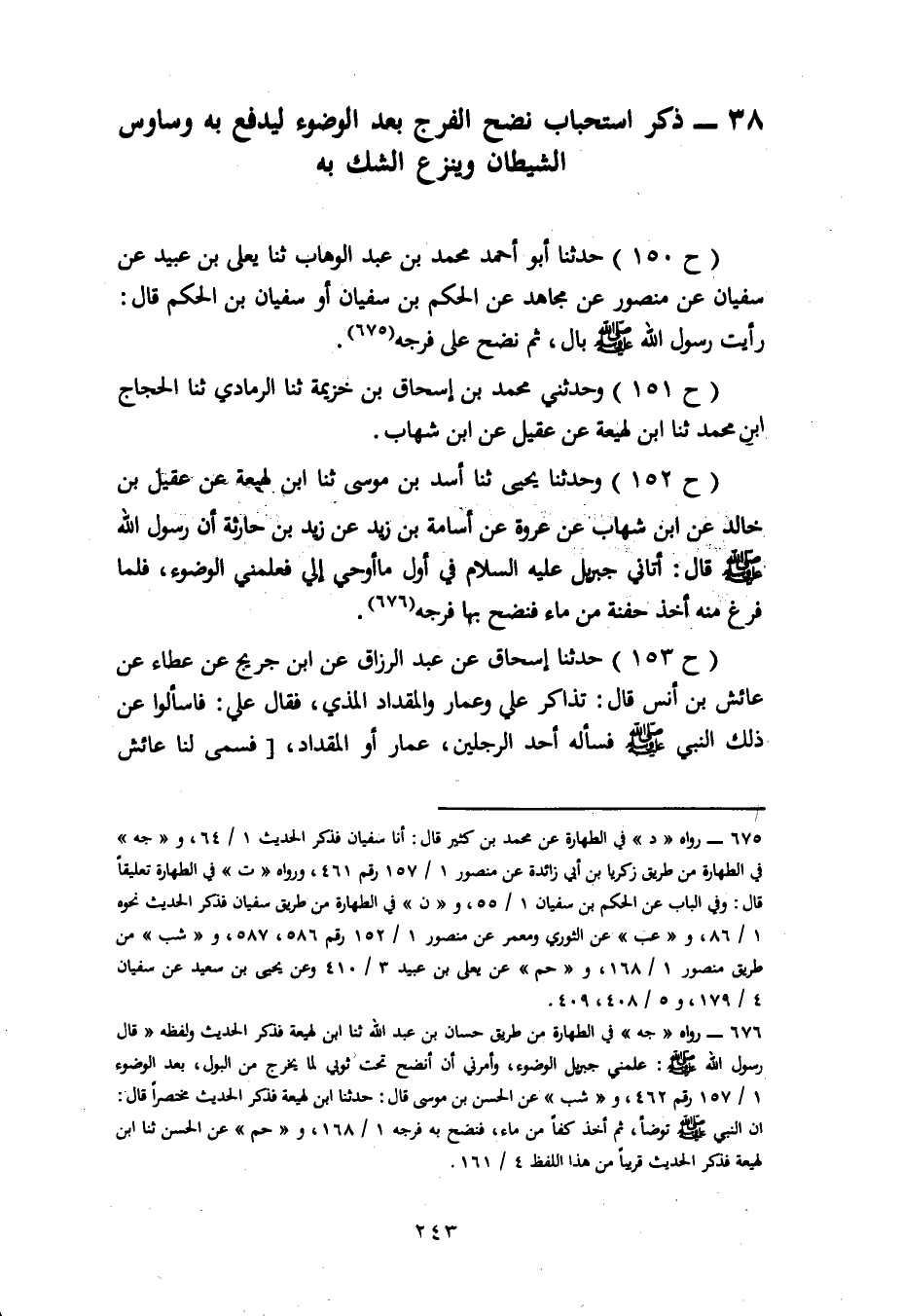 152 - وَحَدَّثَنَا يَحْيَى، ثنا أَسَدُ بْنُ مُوسَى، ثنا ابْنُ لَهِيعَةَ، عَنْ عَقِيلِ بْنِ خَالِدٍ، عَنِ ابْنِ شِهَابٍ عَنْ عُرْوَةَ عَنْ أُسَامَةَ بْنِ زَيْدٍ، عَنْ زَيْدِ بْنِ حَارِثَةَ، أَنَّ رَسُولَ اللهِ صَلَّى اللَّهُ عَلَيْهِ وَسَلَّمَ قَالَ: «أَتَانِي جِبْرِيلُ عَلَيْهِ السَّلَامُ فِي أَوَّلِ مَا أُوحِيَ إِلَيَّ فَعَلَّمَنِي الْوُضُوءَ، فَلَمَّا فَرَغَ مِنْهُ أَخَذَ حَفْنَةً مِنْ مَاءٍ فَنَضَحَ بِهَا فَرْجَهُ»